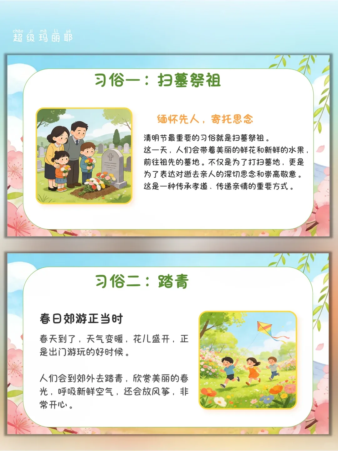 还有扫墓祭祖、踏青、插柳、吃青团等 6 大传统习俗,搭配童趣满满的解读,孩子超容易理解✨