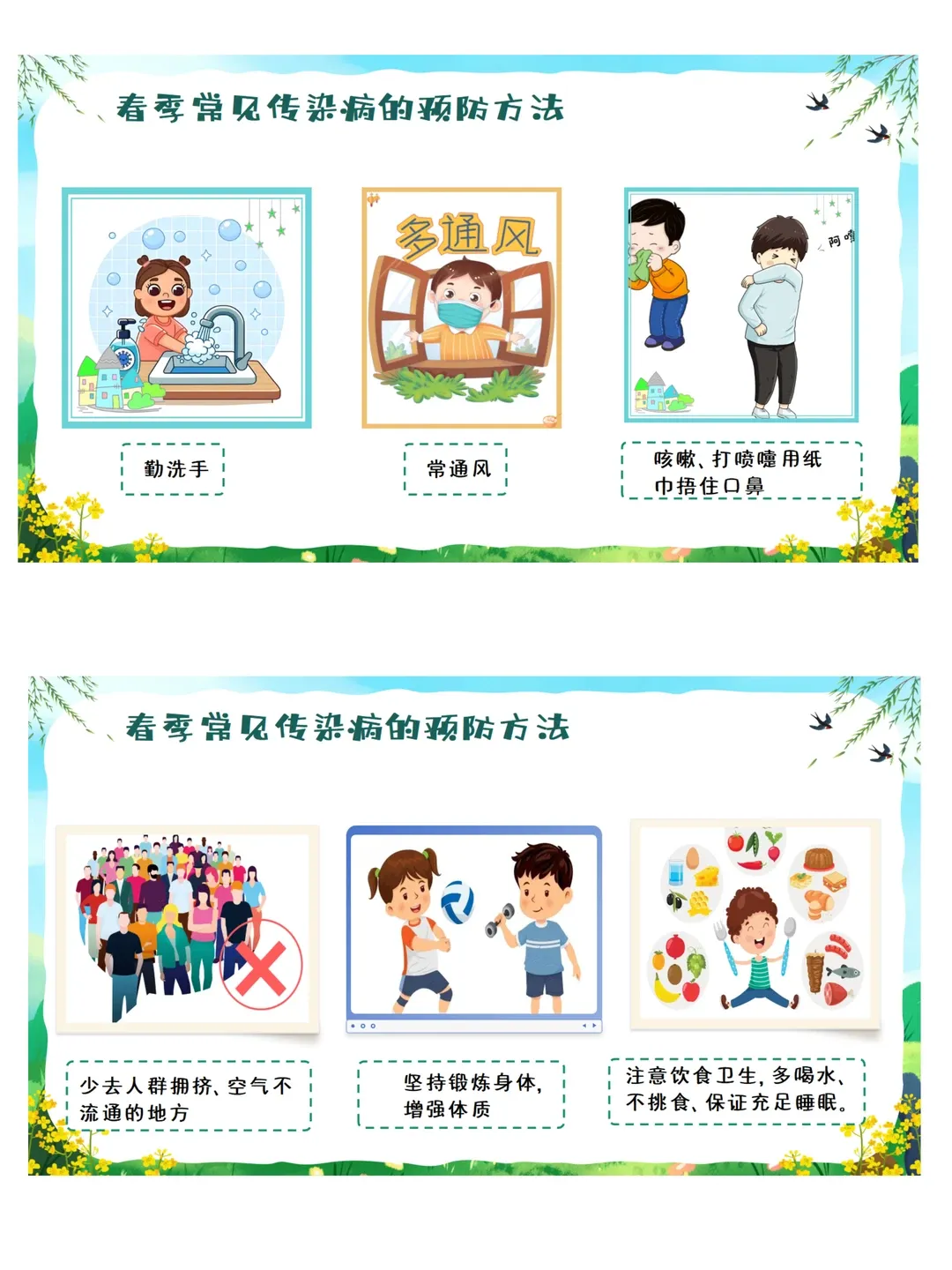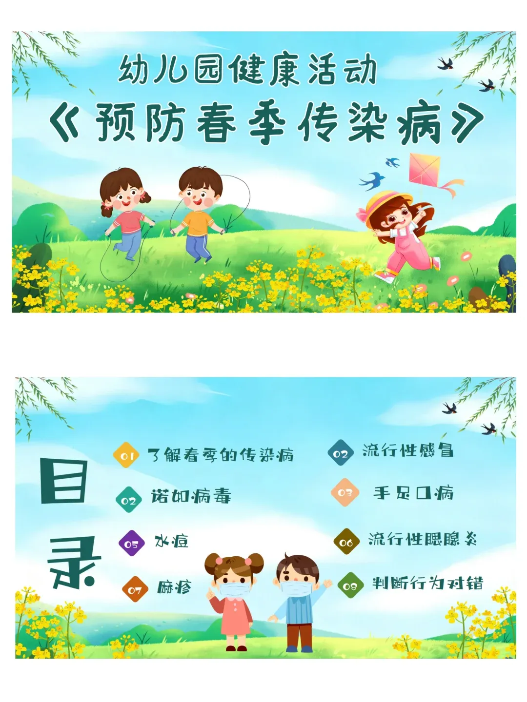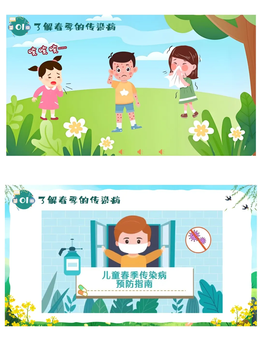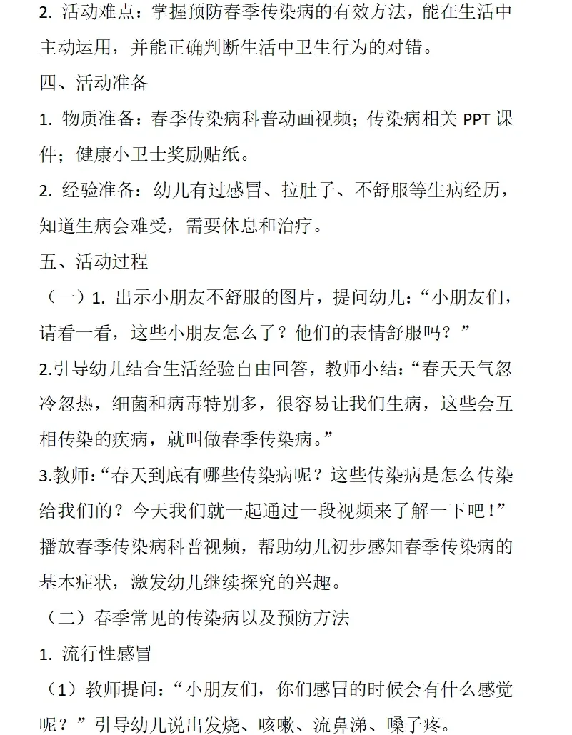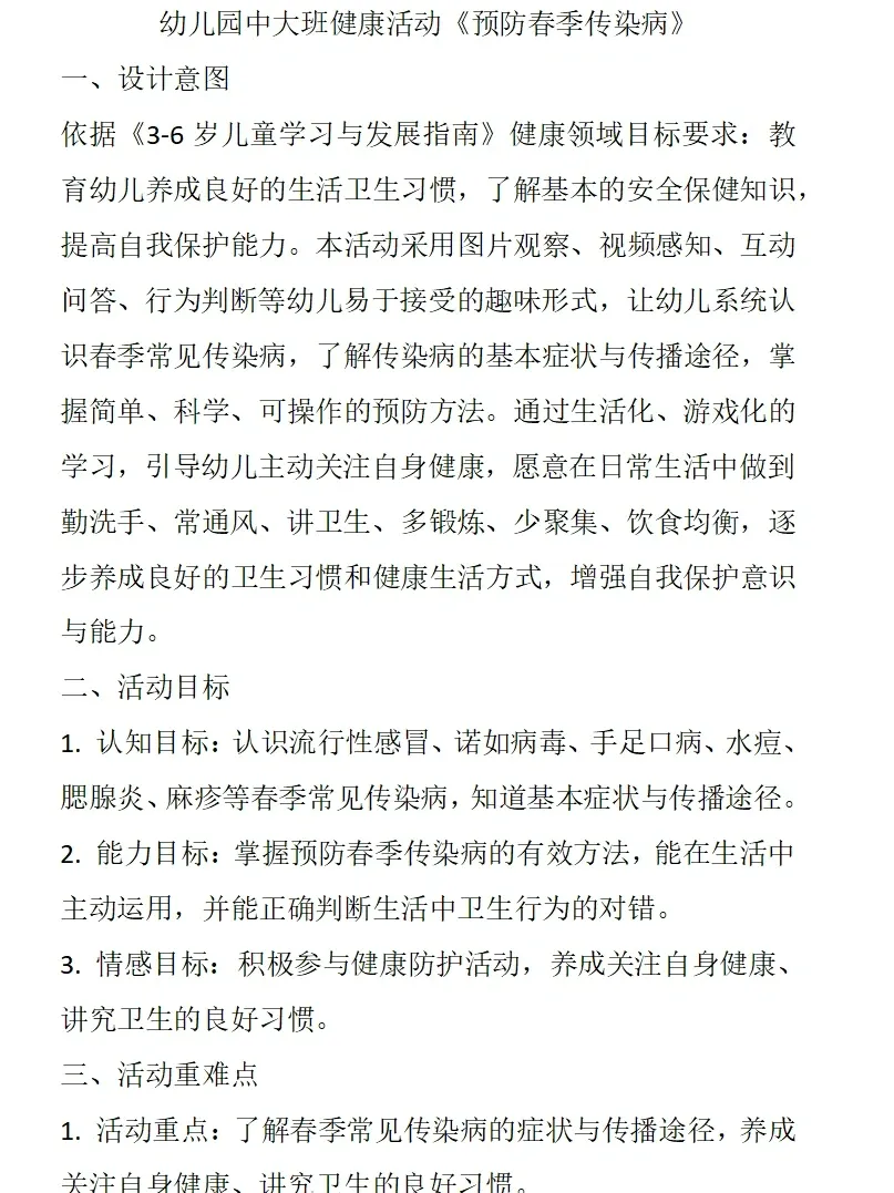 依据《3-6岁儿童学习与发展指南》健康领域目标要求:教育幼儿养成良好的生活卫生习惯,了解基本的安全保健知识,提高自我保护能力。本活动采用图片观察、视频感知、互动问答、行为判断等幼儿易于接受的趣味形式,让幼儿系统认识春季常见传染病,了解传染病的基本症状与传播途径,掌握简单、科学、可操作的预防方法。通过生活化、游戏化的学习,引导幼儿主动关注自身健康,愿意在日常生活中做到勤洗手、常通风、讲卫生、多锻炼、少聚集、饮食均衡,逐步养成良好的卫生习惯和健康生活方式,增强自我保护意识与能力。