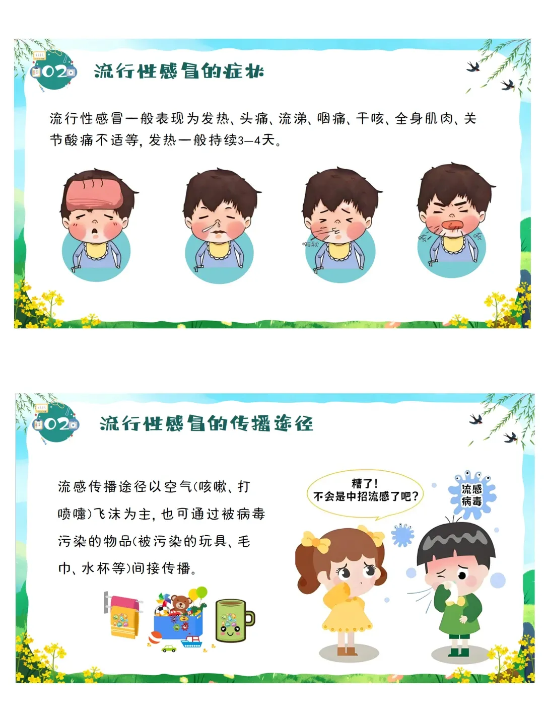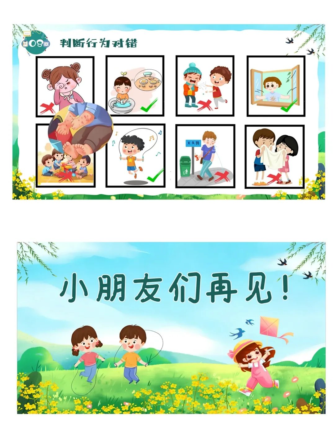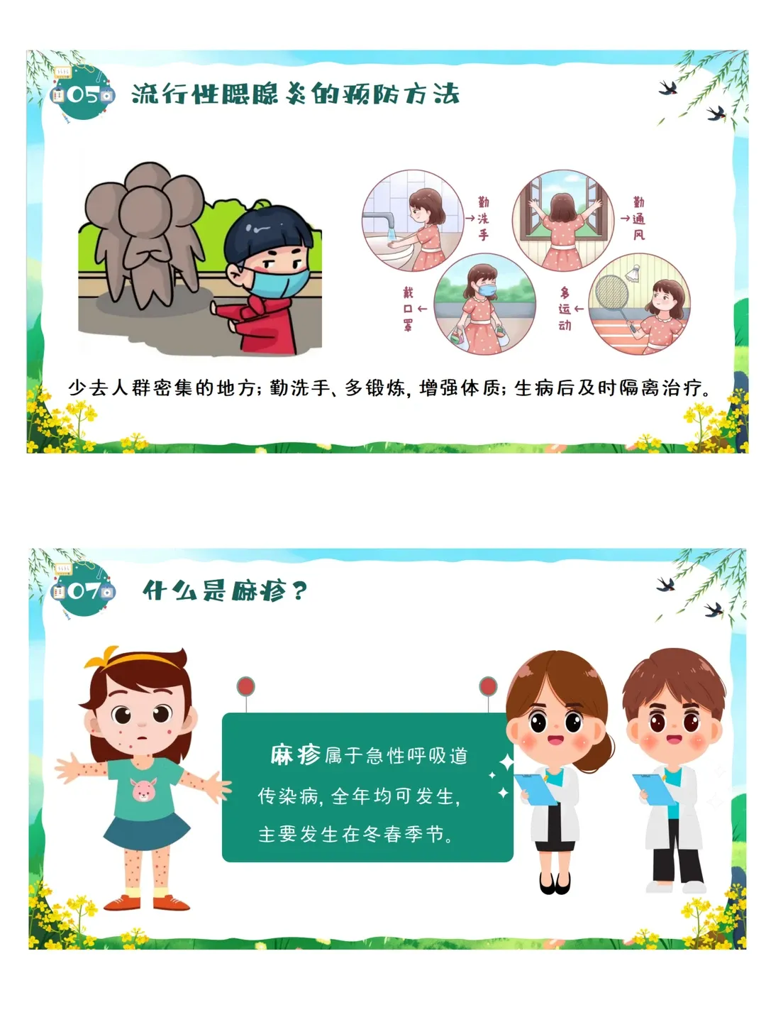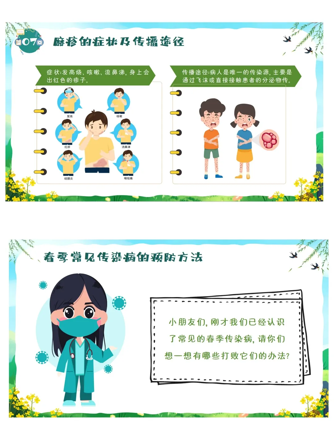 依据《3-6岁儿童学习与发展指南》健康领域目标要求:教育幼儿养成良好的生活卫生习惯,了解基本的安全保健知识,提高自我保护能力。本活动采用图片观察、视频感知、互动问答、行为判断等幼儿易于接受的趣味形式,让幼儿系统认识春季常见传染病,了解传染病的基本症状与传播途径,掌握简单、科学、可操作的预防方法。通过生活化、游戏化的学习,引导幼儿主动关注自身健康,愿意在日常生活中做到勤洗手、常通风、讲卫生、多锻炼、少聚集、饮食均衡,逐步养成良好的卫生习惯和健康生活方式,增强自我保护意识与能力。