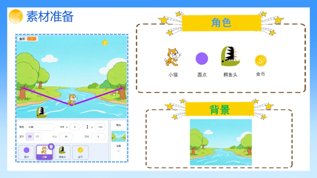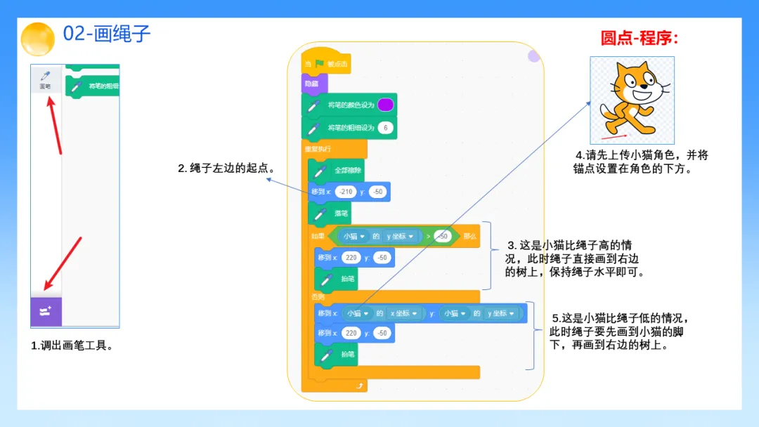 2.熟练掌握画笔模块的功能与使用技巧,通过画笔绘制绳子,并能根据小猫的位置变化实现绳子轨迹的动态更新。