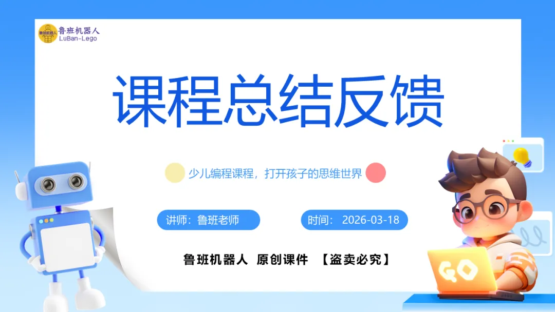编程讲解部分,课件中包含详细完整的编程讲解,这里只展示1页。课程总结,这部分内容主要是方便老师做课后反馈,发家长群使用。老师们请根据需要做适当修改。各位家长好!