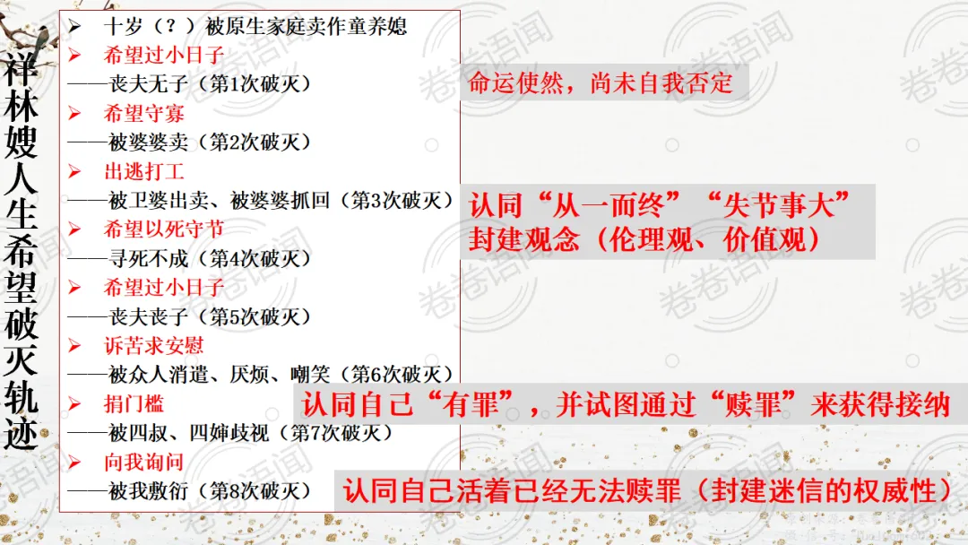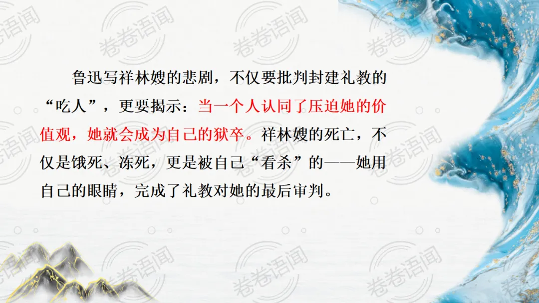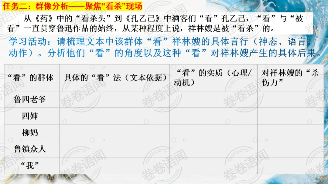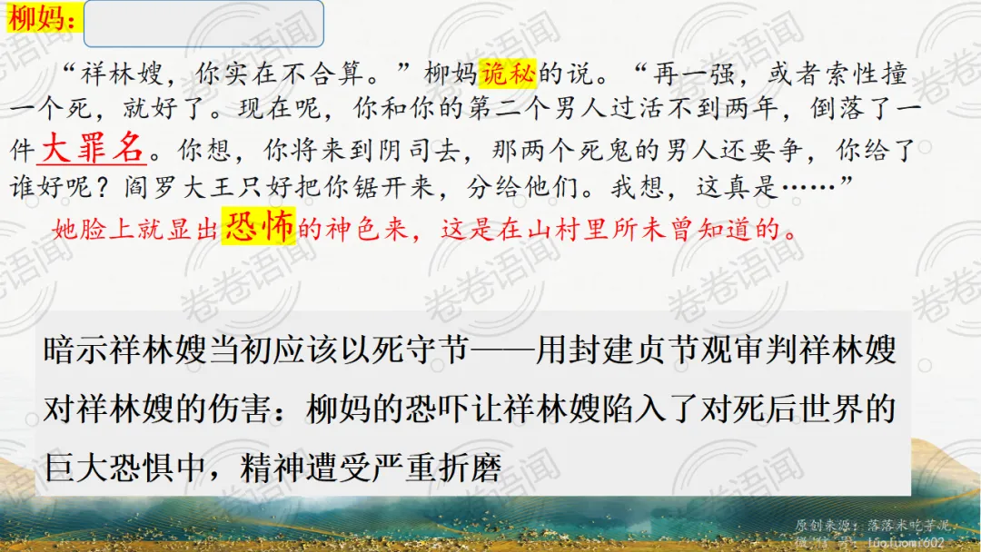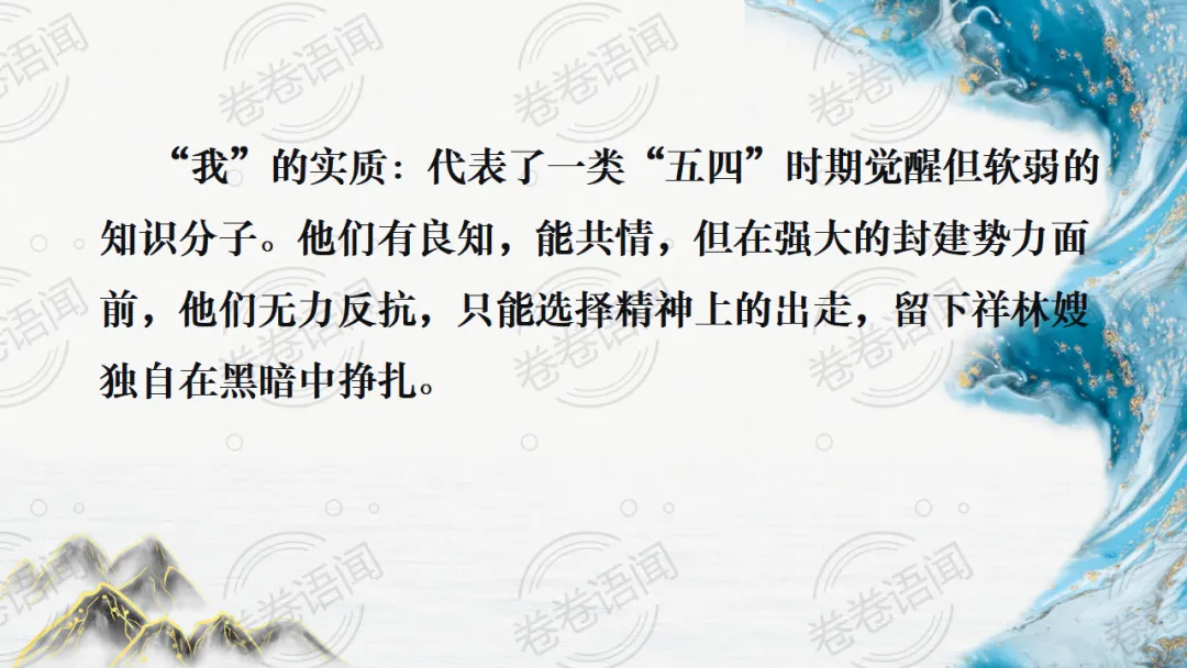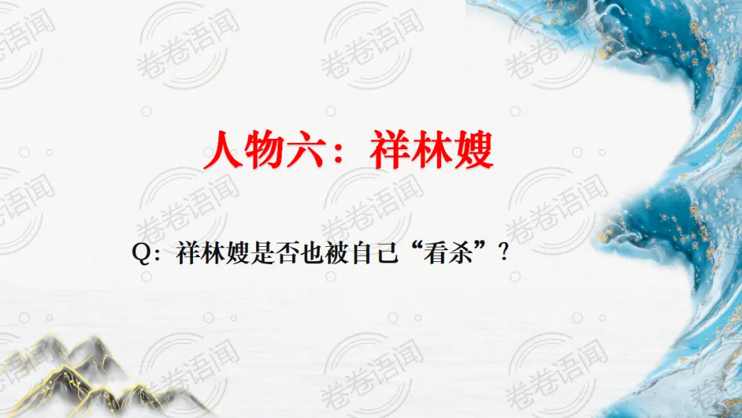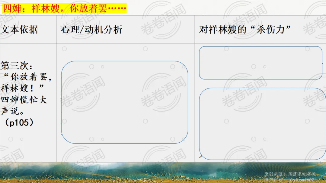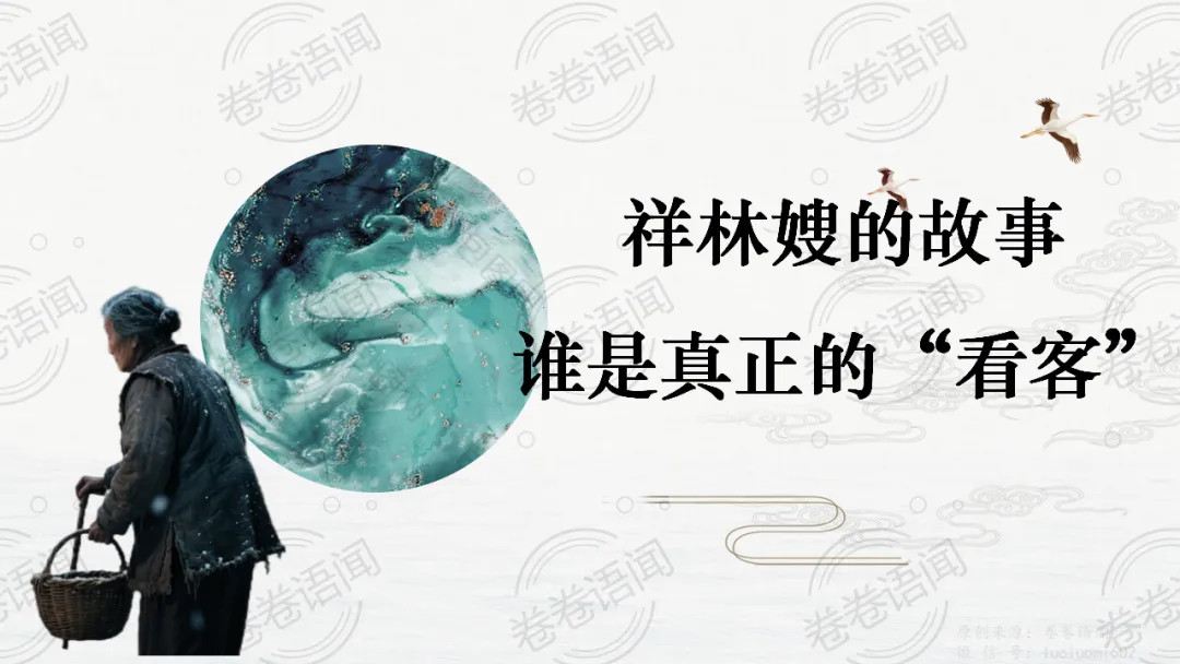 《祝福》是在之前的课件的基础上进行了升级,主线还是围绕祥林嫂的故事和“我”的故事两条线展开。祥林嫂的故事里主要探讨“祥林嫂究竟是如何一步一步走向死亡的”,注意不是分析人物形象,是人物之间的相互作用。