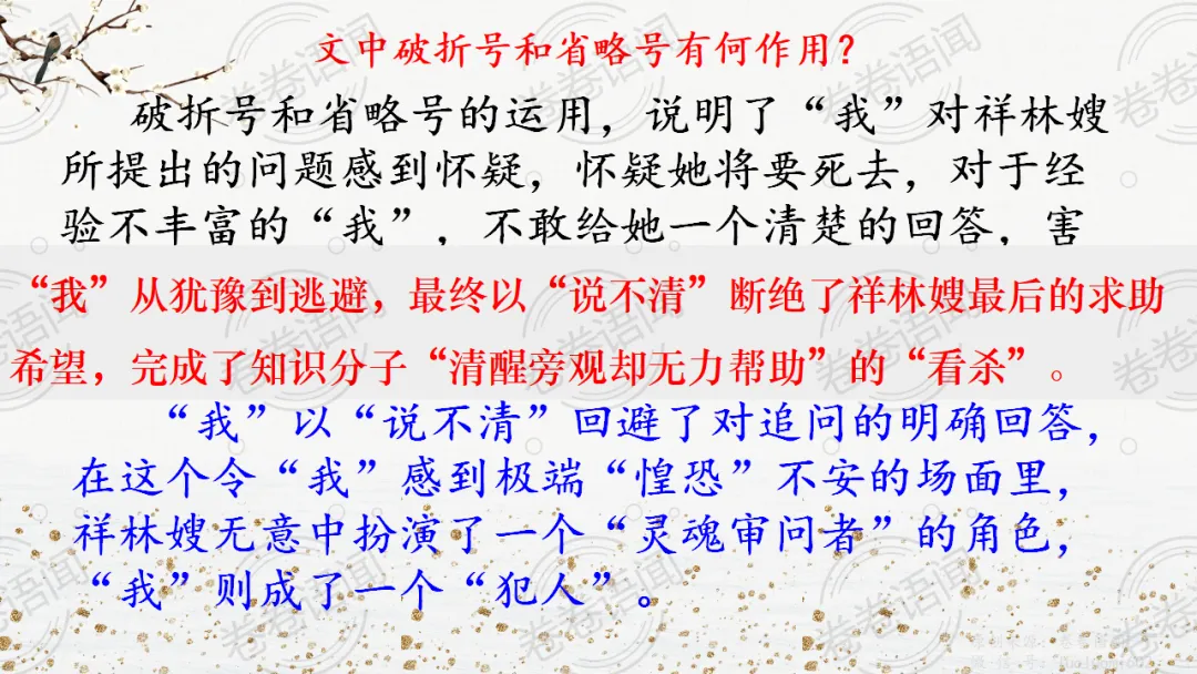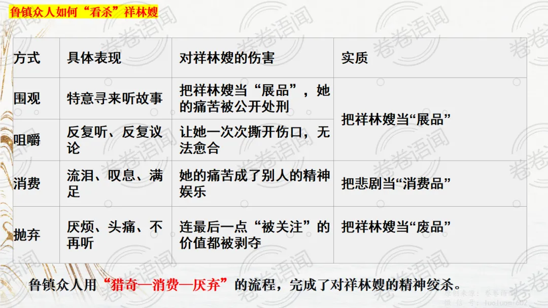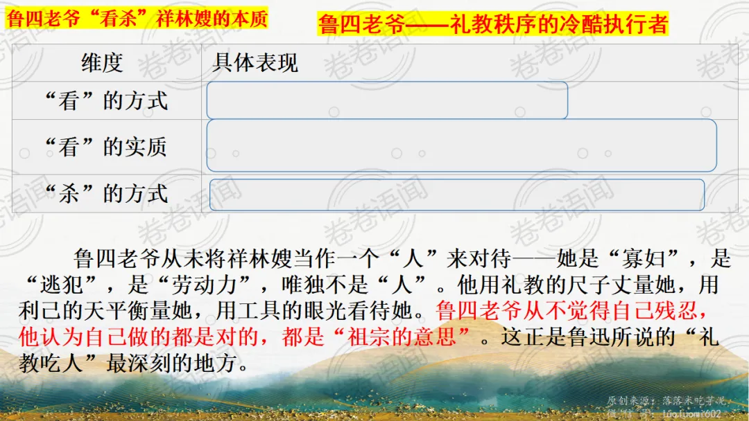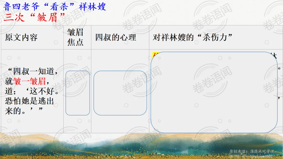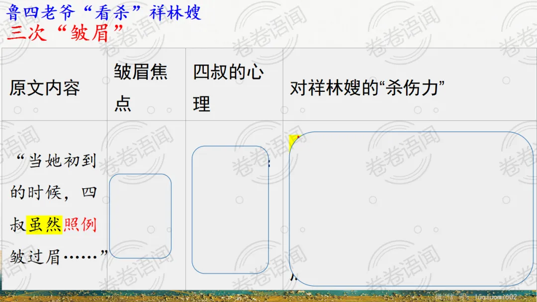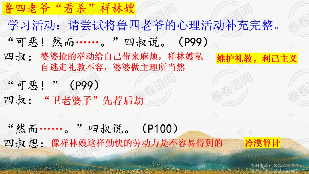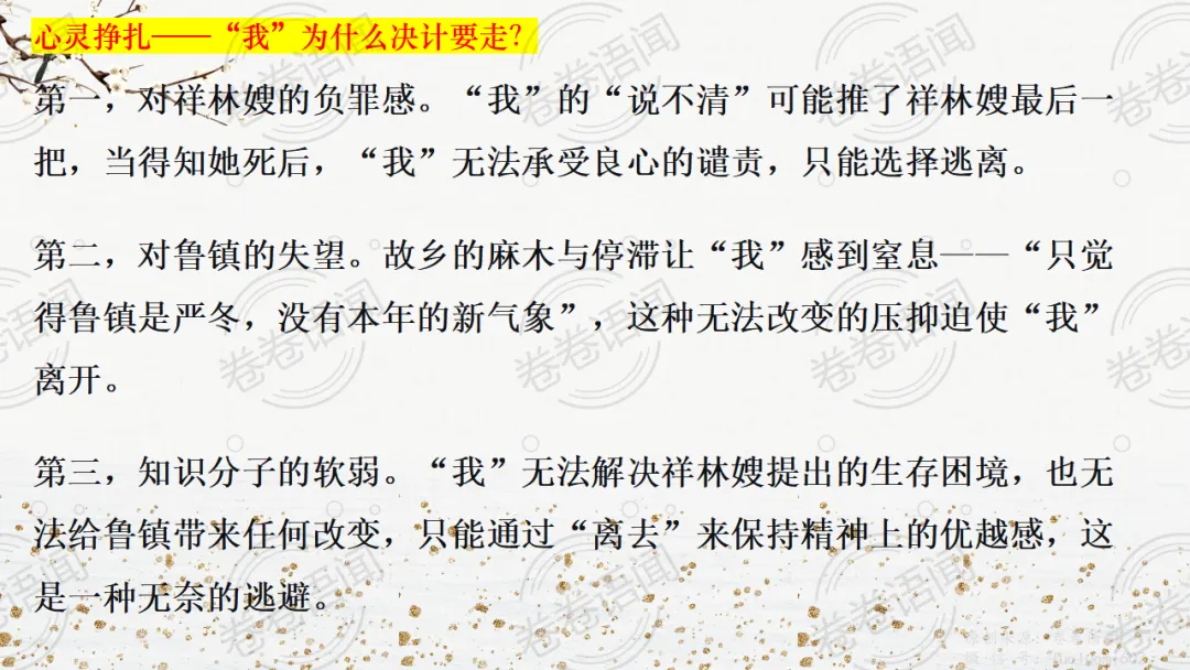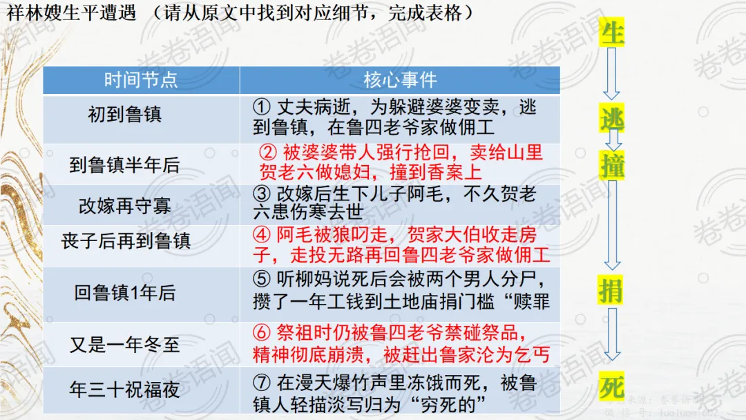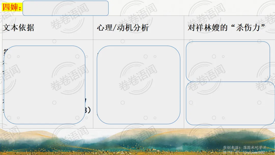 《祝福》是在之前的课件的基础上进行了升级,主线还是围绕祥林嫂的故事和“我”的故事两条线展开。祥林嫂的故事里主要探讨“祥林嫂究竟是如何一步一步走向死亡的”,注意不是分析人物形象,是人物之间的相互作用。
