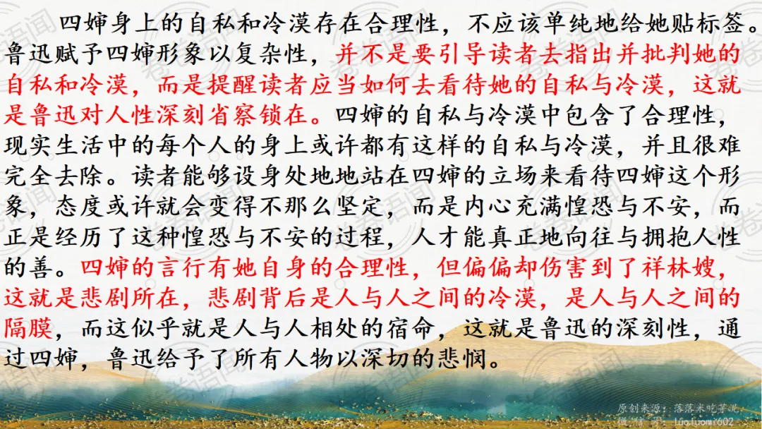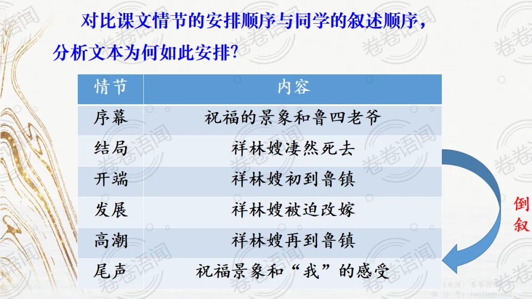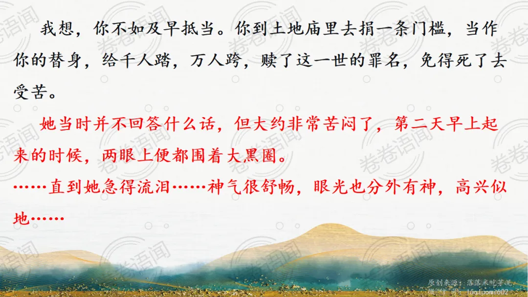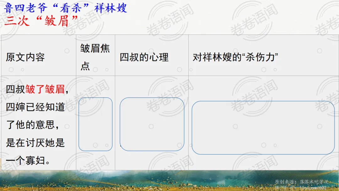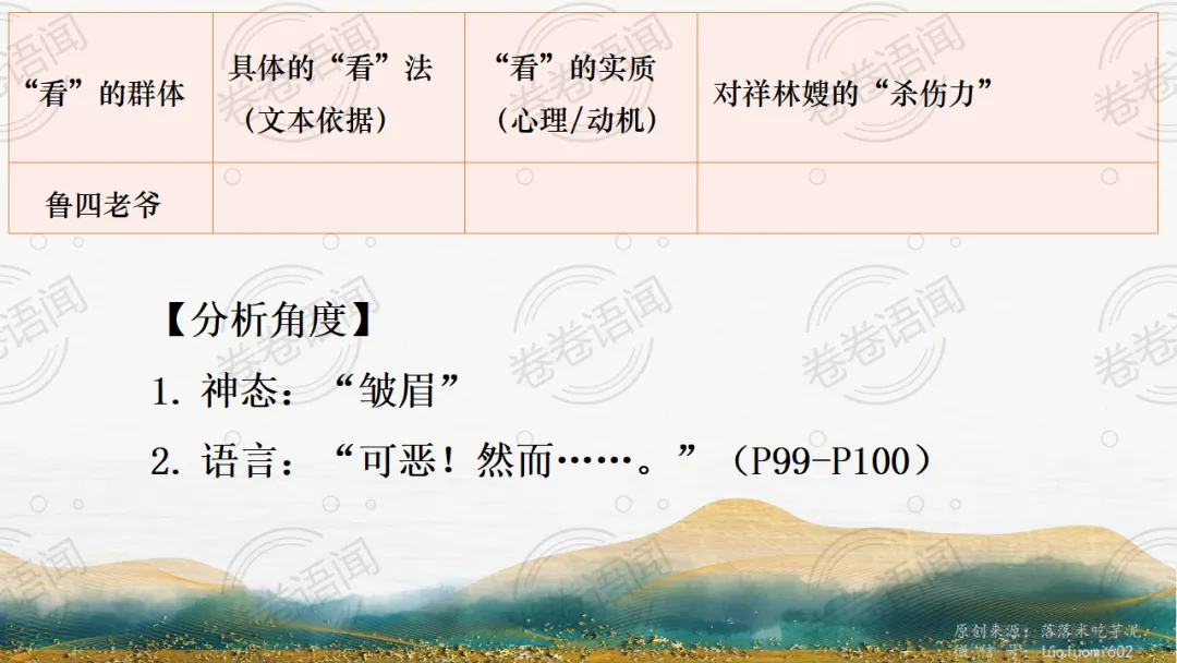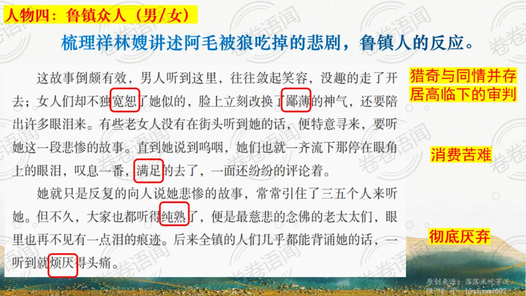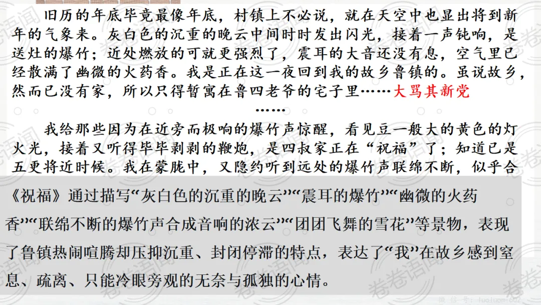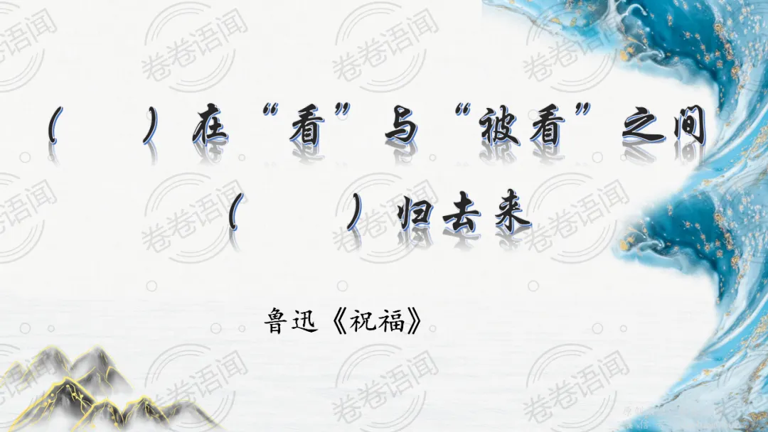 《祝福》是在之前的课件的基础上进行了升级,主线还是围绕祥林嫂的故事和“我”的故事两条线展开。祥林嫂的故事里主要探讨“祥林嫂究竟是如何一步一步走向死亡的”,注意不是分析人物形象,是人物之间的相互作用。