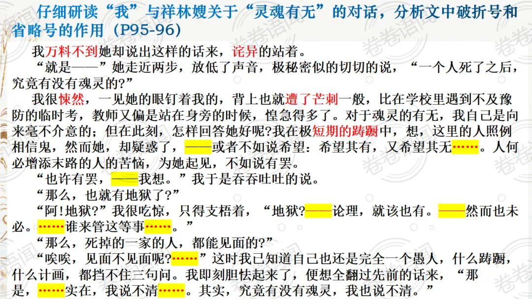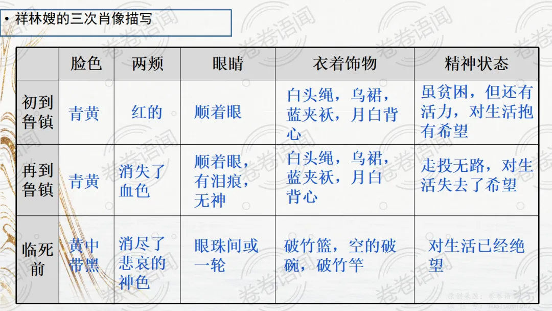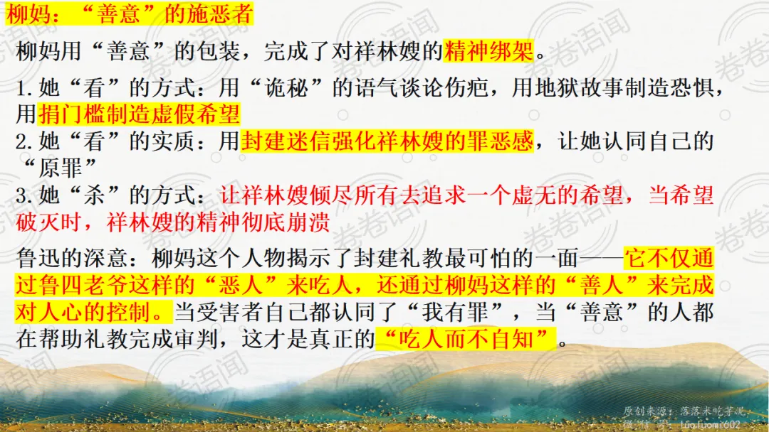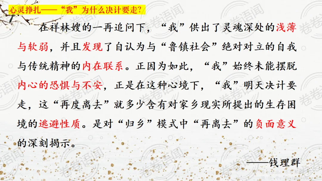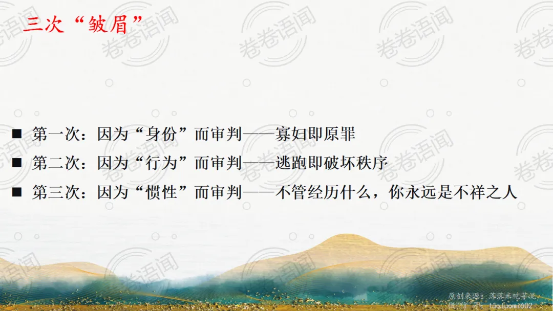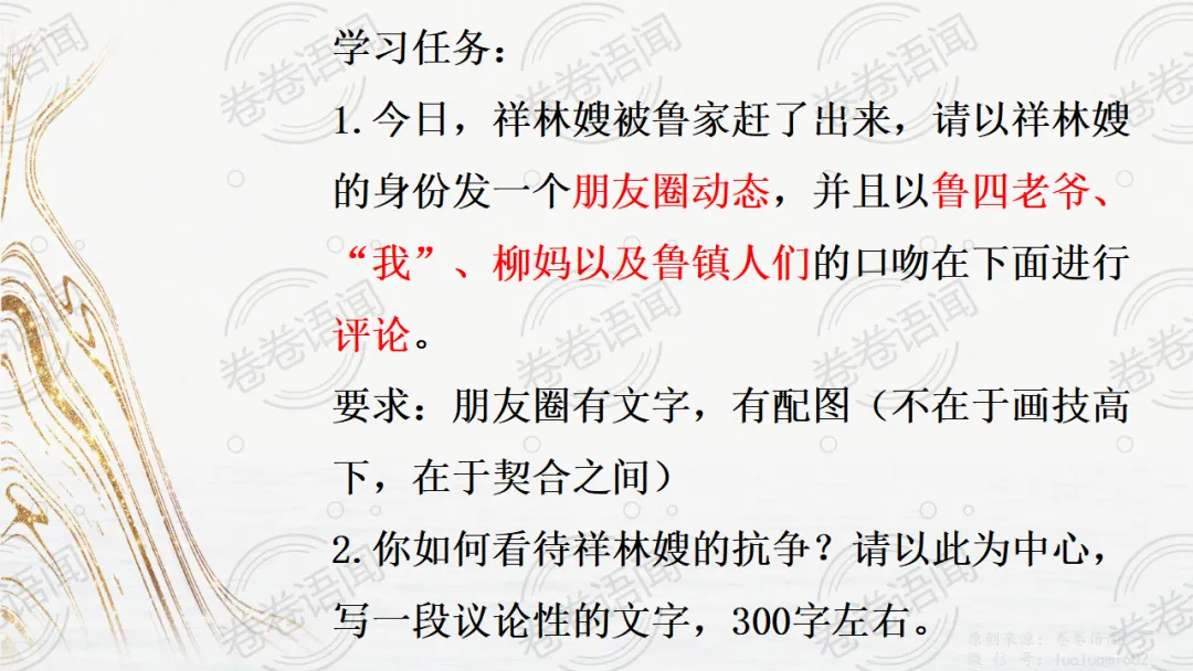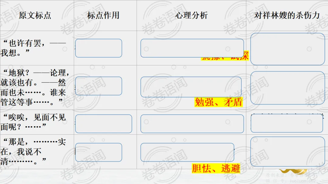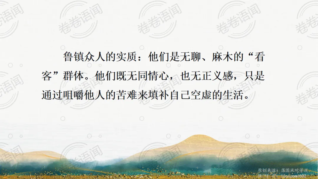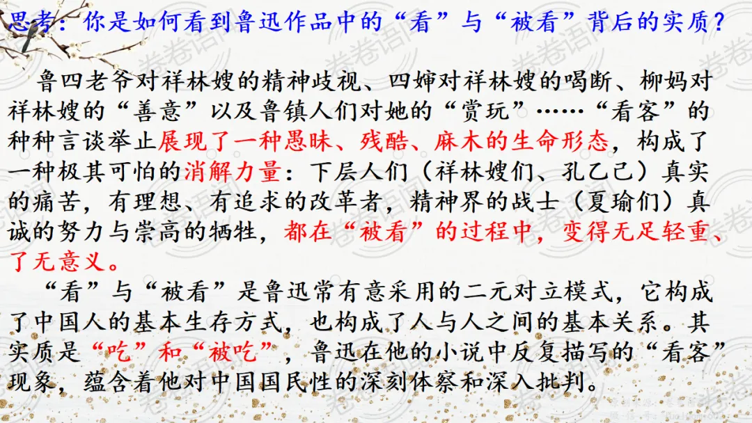 《祝福》是在之前的课件的基础上进行了升级,主线还是围绕祥林嫂的故事和“我”的故事两条线展开。祥林嫂的故事里主要探讨“祥林嫂究竟是如何一步一步走向死亡的”,注意不是分析人物形象,是人物之间的相互作用。