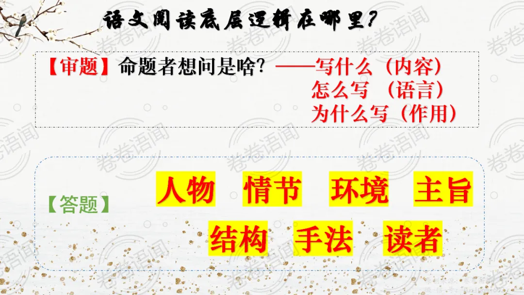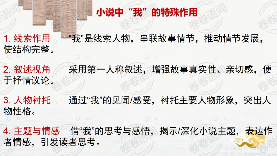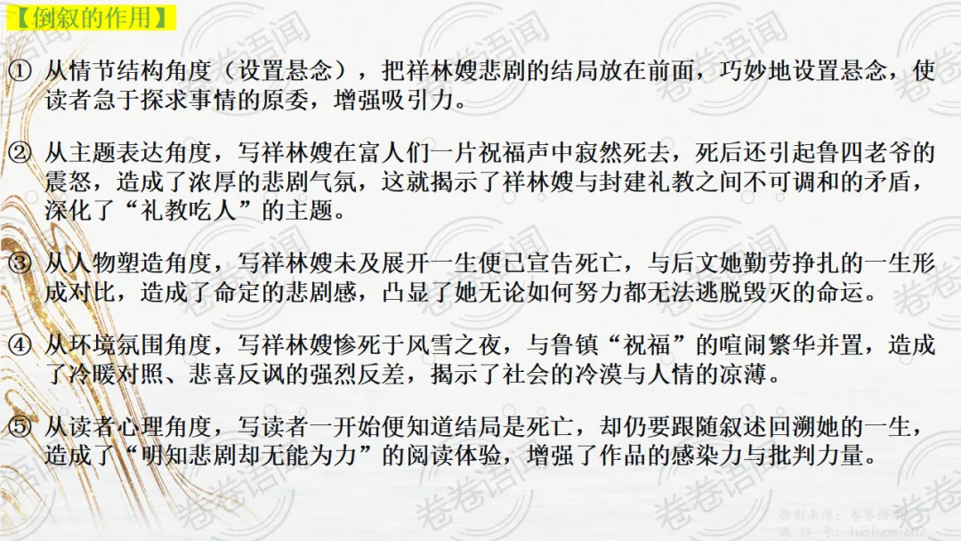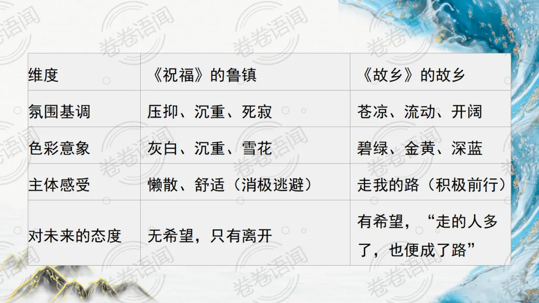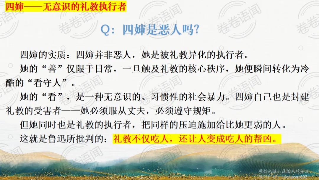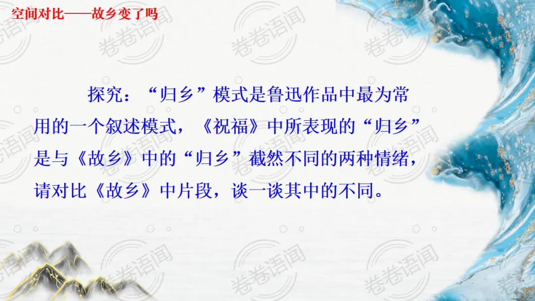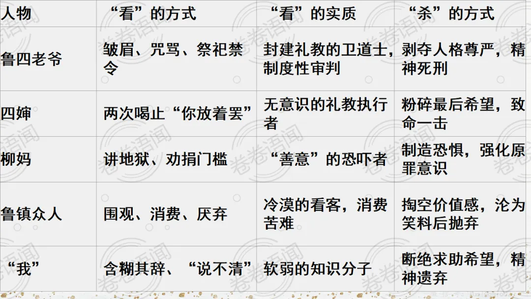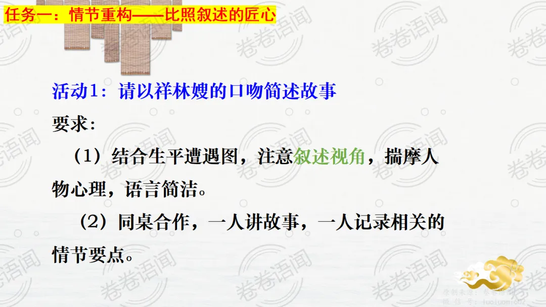 《祝福》是在之前的课件的基础上进行了升级,主线还是围绕祥林嫂的故事和“我”的故事两条线展开。祥林嫂的故事里主要探讨“祥林嫂究竟是如何一步一步走向死亡的”,注意不是分析人物形象,是人物之间的相互作用。