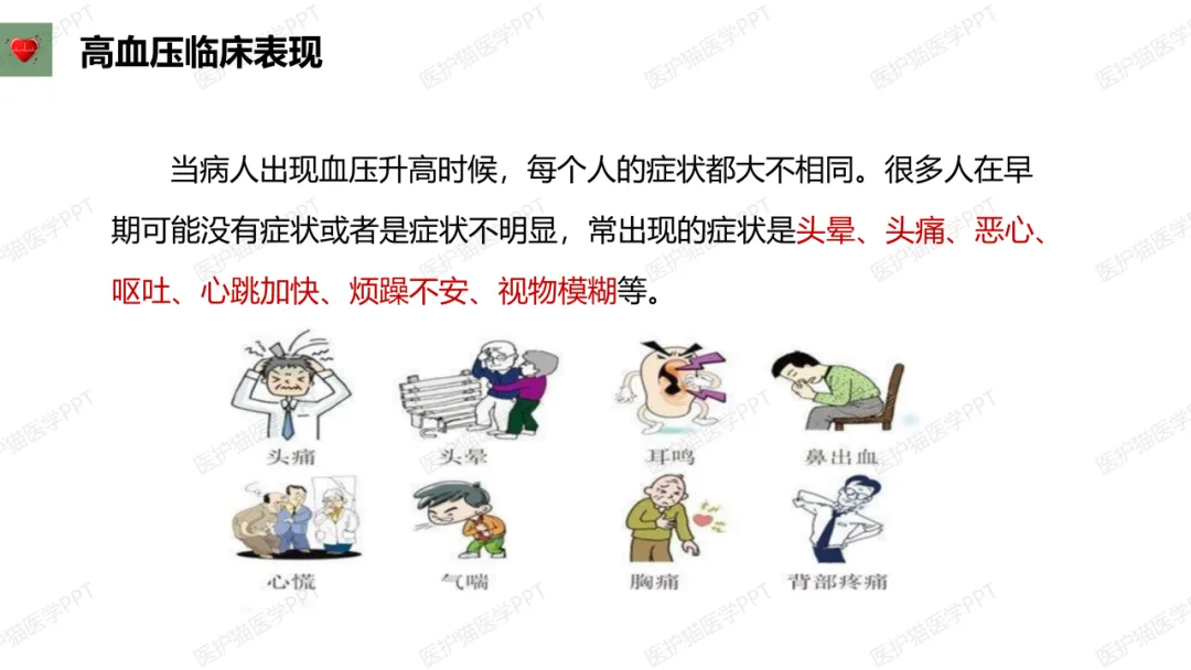 当病人出现血压升高时候,每个人的症状都大不相同。很多人在早期可能没有症状或者是症状不明显,常出现的症状是头晕、头痛、恶心、呕吐、心跳加快、烦躁不安、视物模糊等。