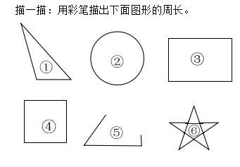 初步感知:请学生用手指一指数学课本封面的边线,摸一摸树叶的边线。引导学生发现“一周”和“起点回到终点”的特点。