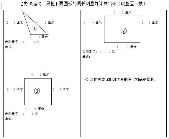 任务:先自主测量1-3号图形直边图形,再小组合作测量手中的物体,如圆形纸片、树叶等的周长。