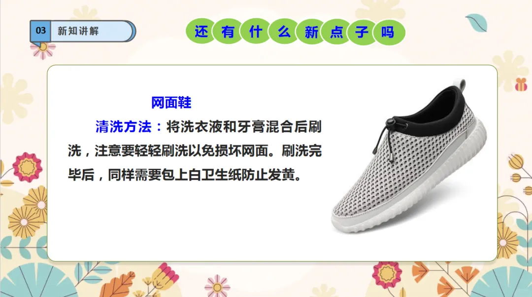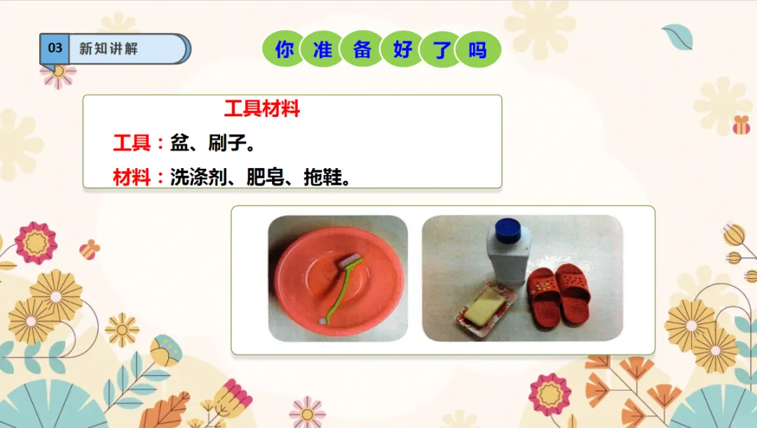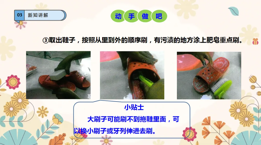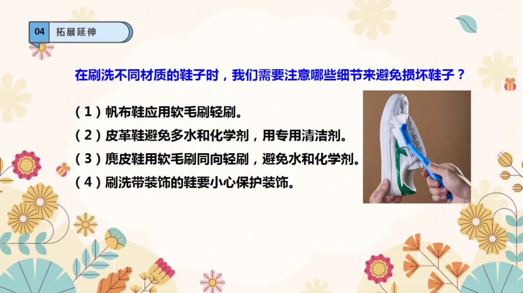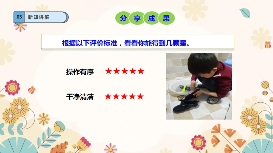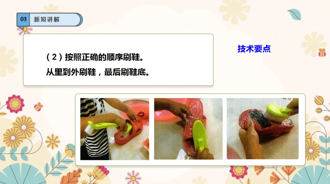 劳动能力:了解刷鞋的方法,能独立把鞋子洗干净,培养动手实践的劳动能力。