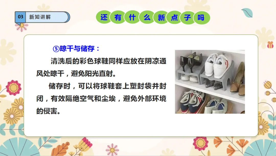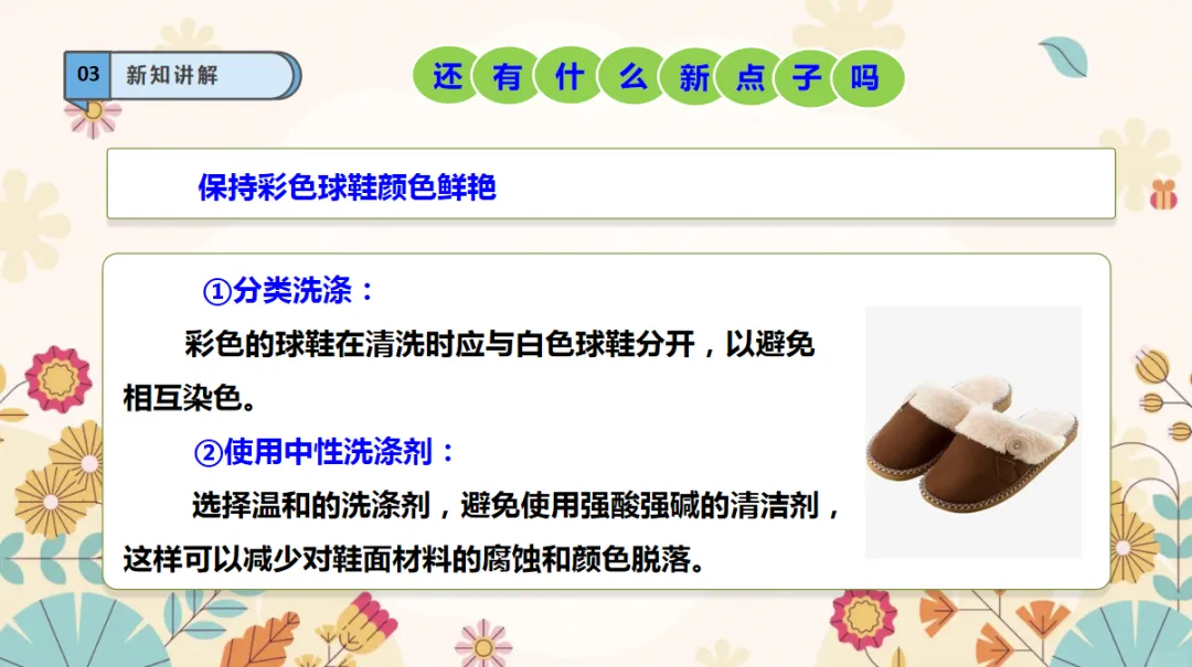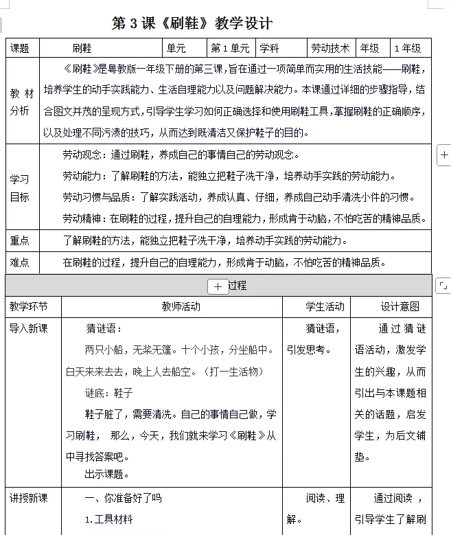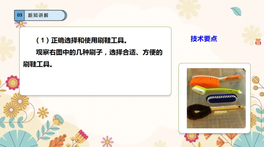 《刷鞋》是粤教版一年级下册的第三课,旨在通过一项简单而实用的生活技能——刷鞋,培养学生的动手实践能力、生活自理能力以及问题解决能力。本课通过详细的步骤指导,结合图文并茂的呈现方式,引导学生学习如何正确选择和使用刷鞋工具,掌握刷鞋的正确顺序,以及处理不同污渍的技巧,从而达到既清洁又保护鞋子的目的。劳动观念:通过刷鞋,养成自己的事情自己的劳动观念。