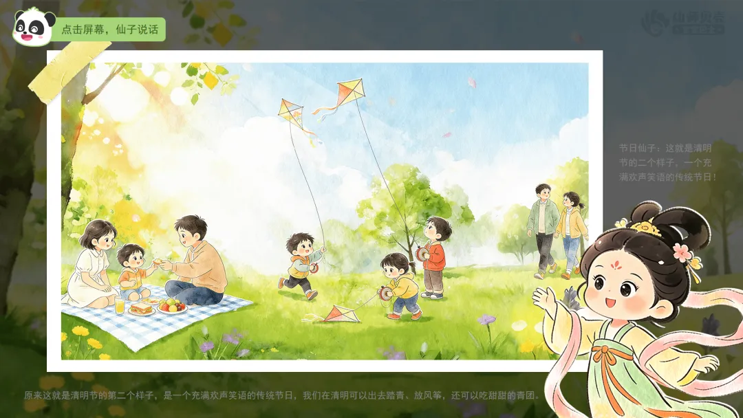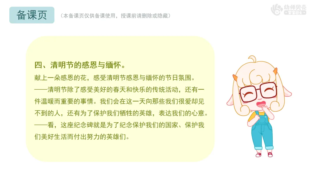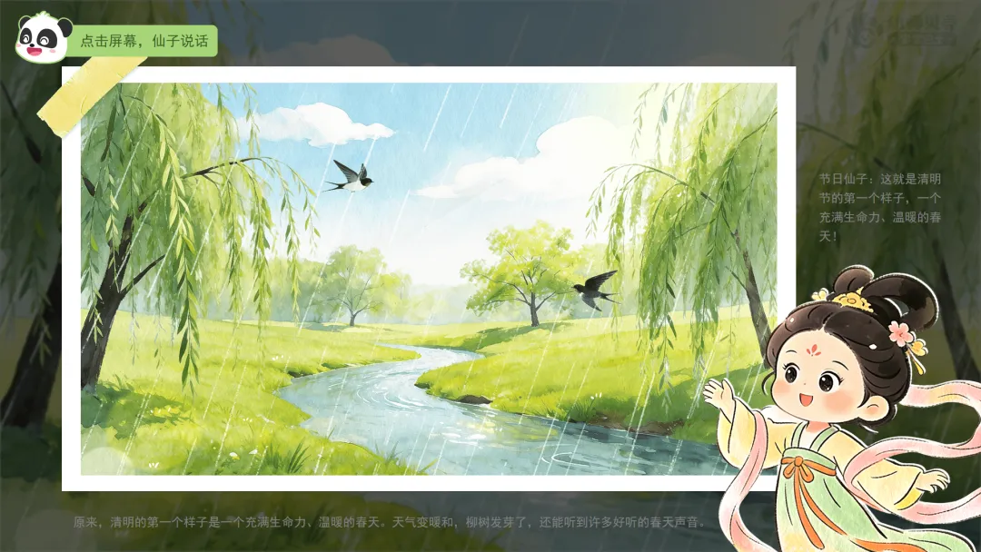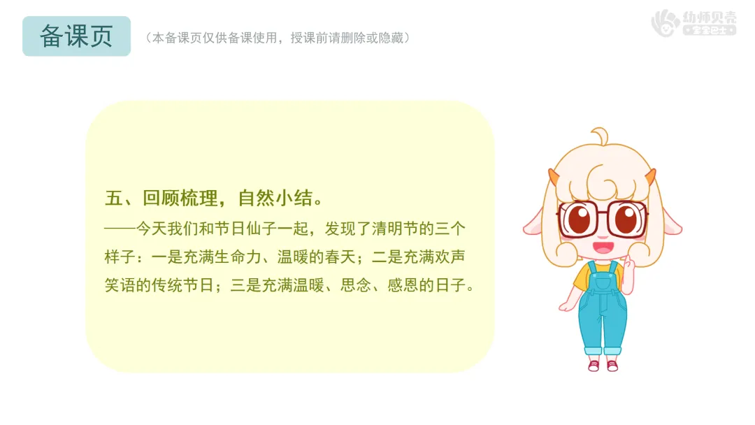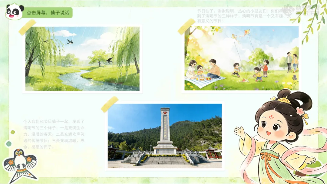 ——今天我们和节日仙子一起,发现了清明节的三个样子:一是充满生命力、温暖的春天;二是充满欢声笑语的传统节日;三是充满温暖、思念、感恩的日子。