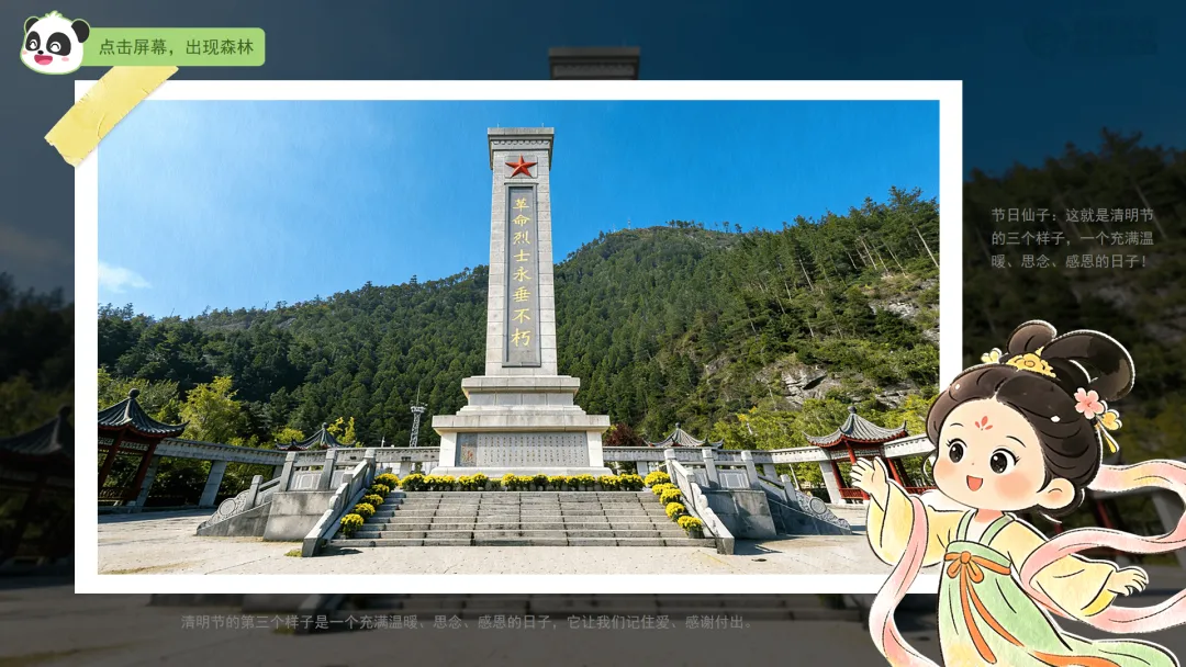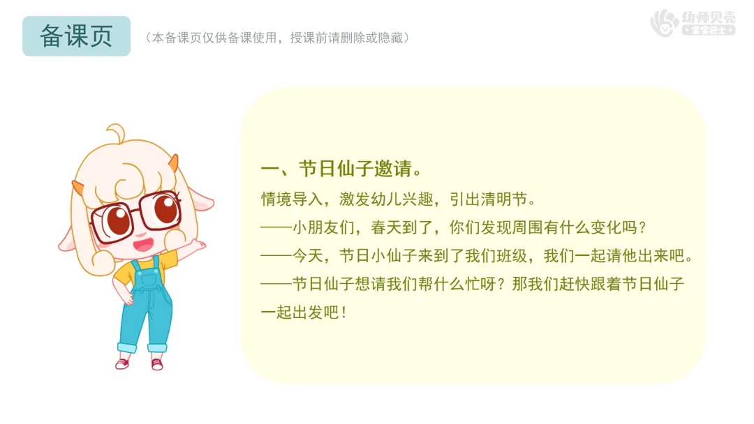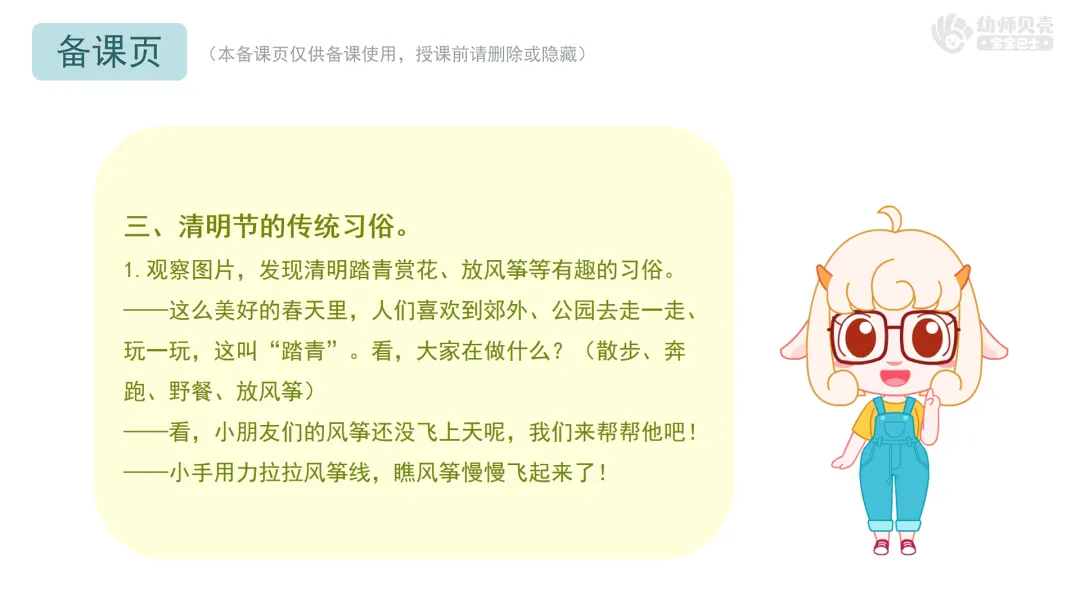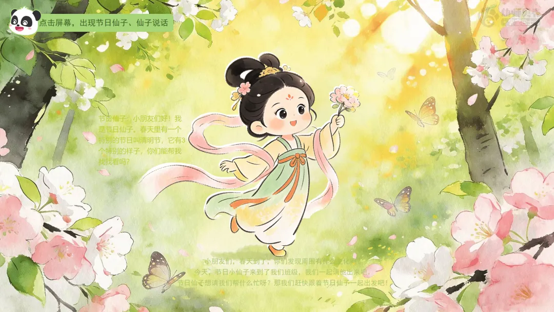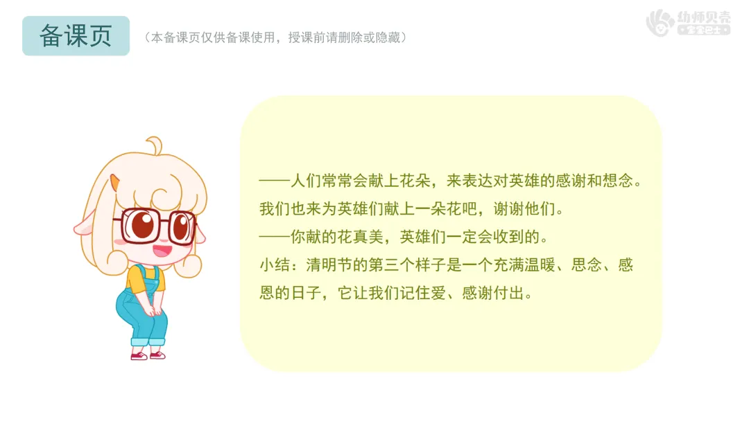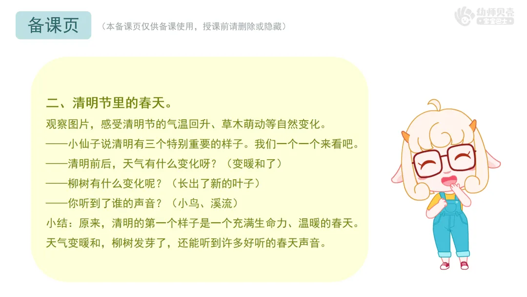 ——今天我们和节日仙子一起,发现了清明节的三个样子:一是充满生命力、温暖的春天;二是充满欢声笑语的传统节日;三是充满温暖、思念、感恩的日子。