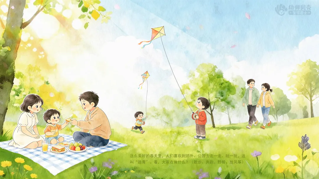 ——这么美好的春天里,人们喜欢到郊外、公园去走一走、玩一玩,这叫“踏青”。看,大家在做什么?(散步、奔跑、野餐、放风筝)