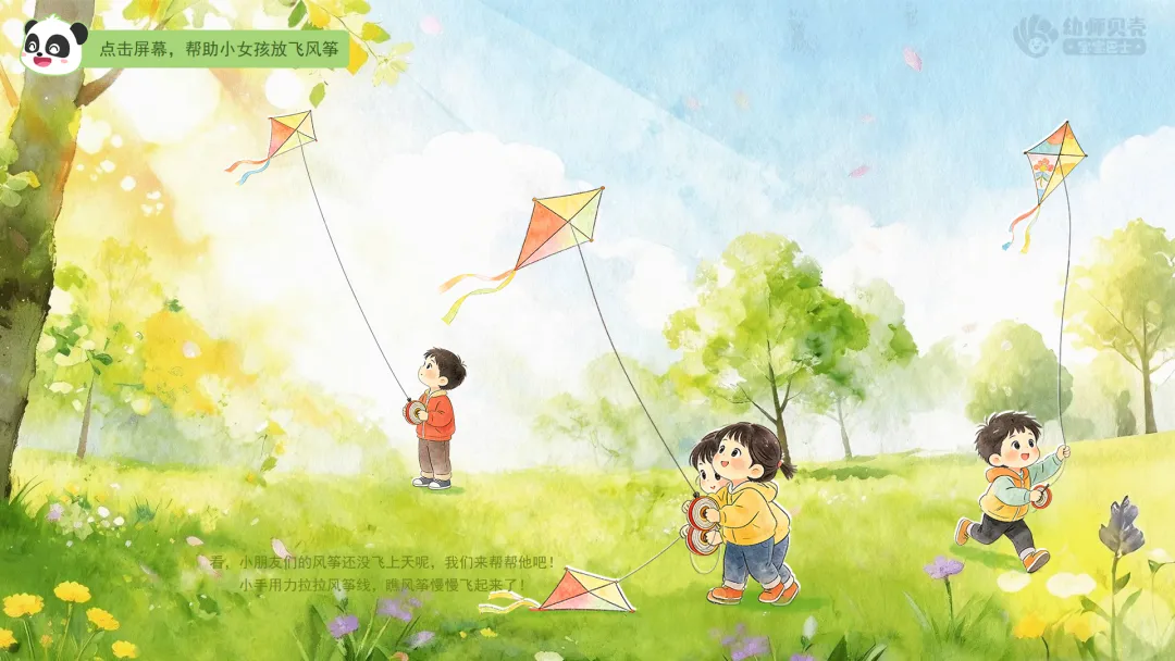 ——看,小朋友们的风筝还没飞上天呢,我们来帮帮他吧!