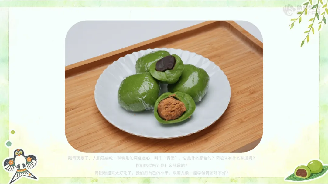 ——青团看起来太好吃了,我们用自己的小手,跟着儿歌一起学做青团好不好?