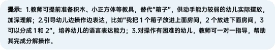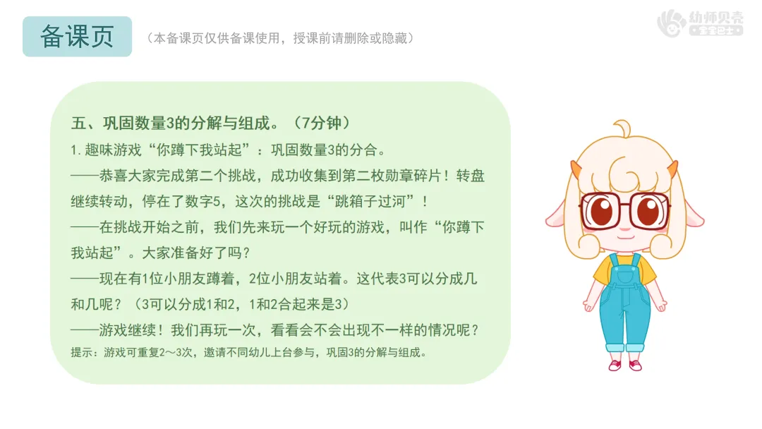 《指南》明确中班幼儿需“感知数的数量关系、用简单数学方法解决生活问题”,故围绕“3 的分解与组成”展开:选“3”是因其为幼儿生活常见数量、仅两种分合形式,适配认知水平;用“箱子大挑战”闯关游戏,将知识转化为“推箱子”“装箱子”“跳箱子”等活动,搭配纸面教具、地面数字箱,契合《指南》“游戏中学习”的倡导;最后联系分点心、分玩具的生活场景,落实《指南》“数学知识服务生活”的要求,助力幼儿达成领域发展目标。