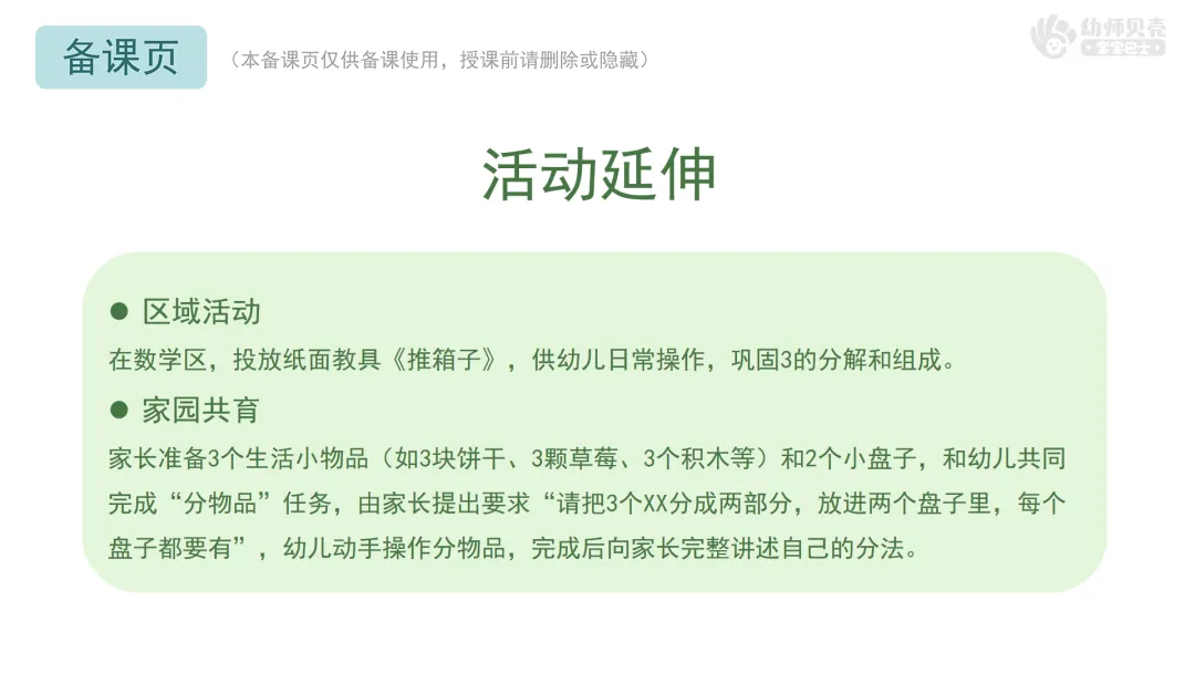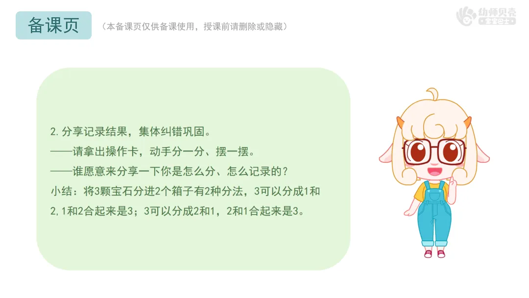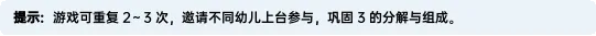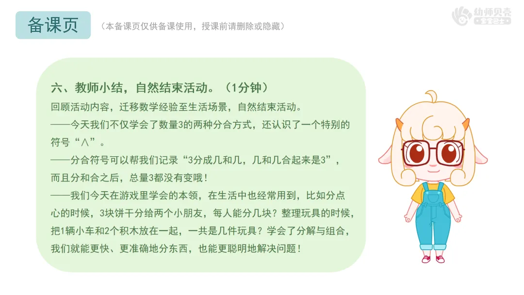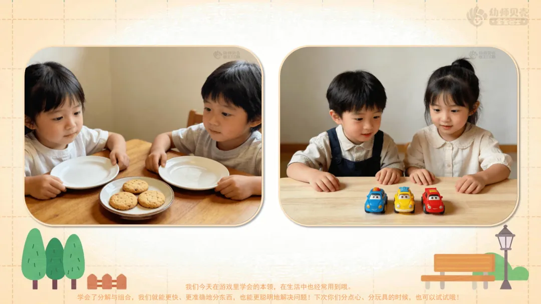 ——我们今天在游戏里学会的本领,在生活中也经常用到,比如分点心的时候,3块饼干分给两个小朋友,每人能分几块?整理玩具的时候,把1辆小车和2个积木放在一起,一共是几件玩具?学会了分解与组合,我们就能更快、更准确地分东西,也能更聪明地解决问题!