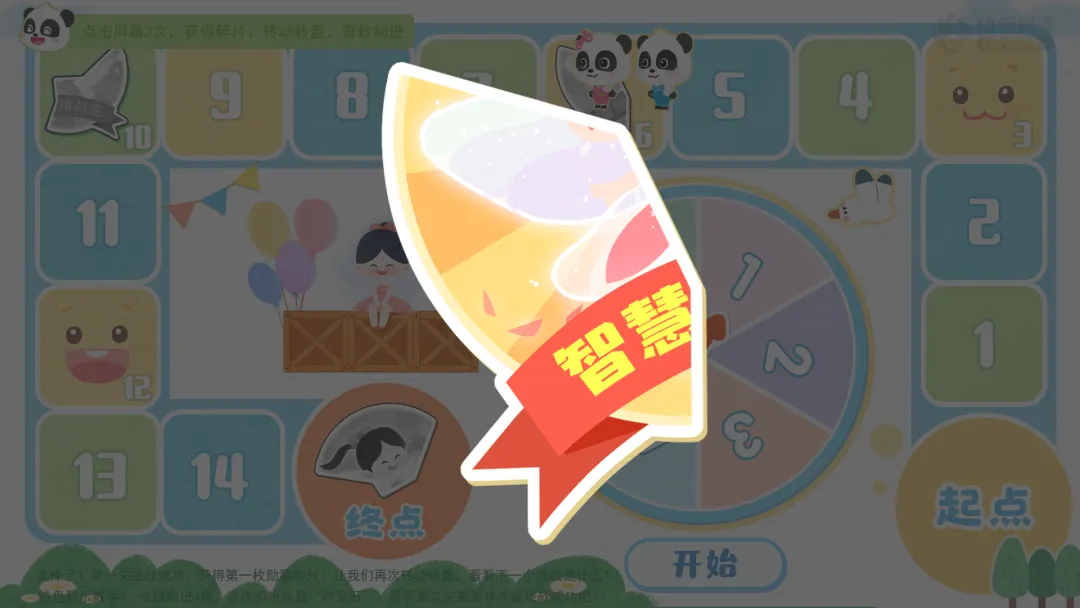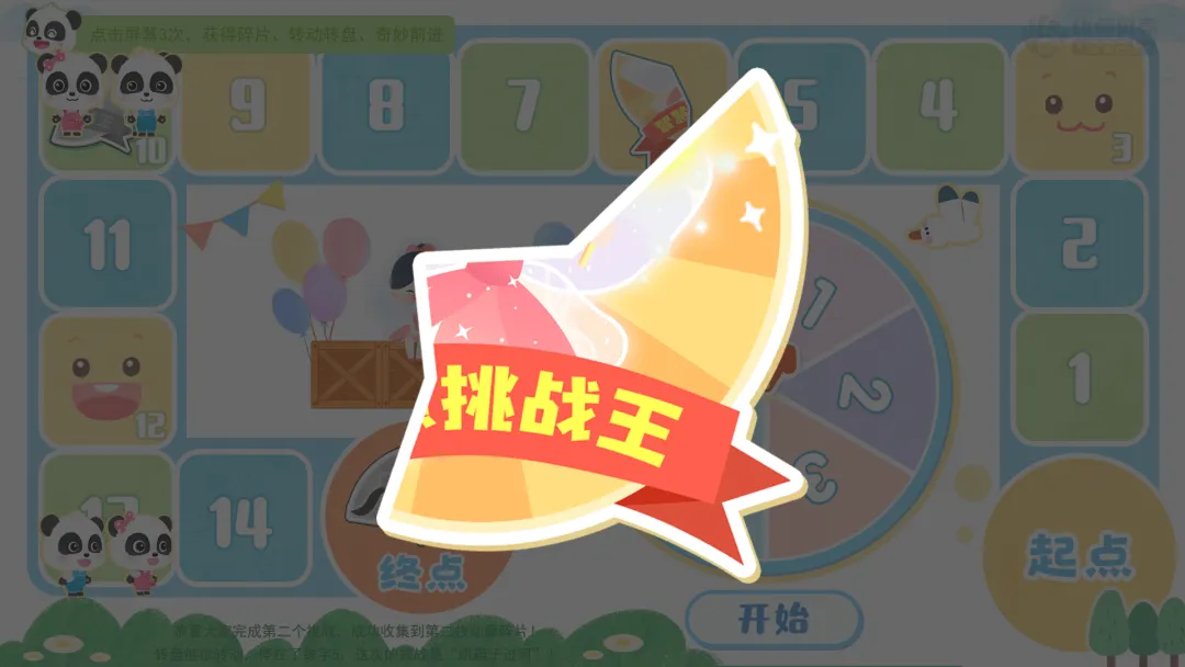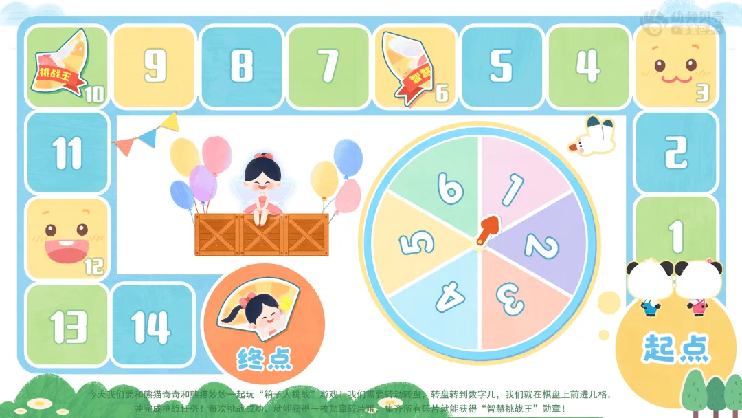 ——我们需要转动转盘,转到数字几,就在棋盘上前进几格,并完成格子里的挑战任务!每次挑战成功,就能获得一枚勋章碎片,集齐所有碎片就能获得“智慧挑战王”勋章哦!