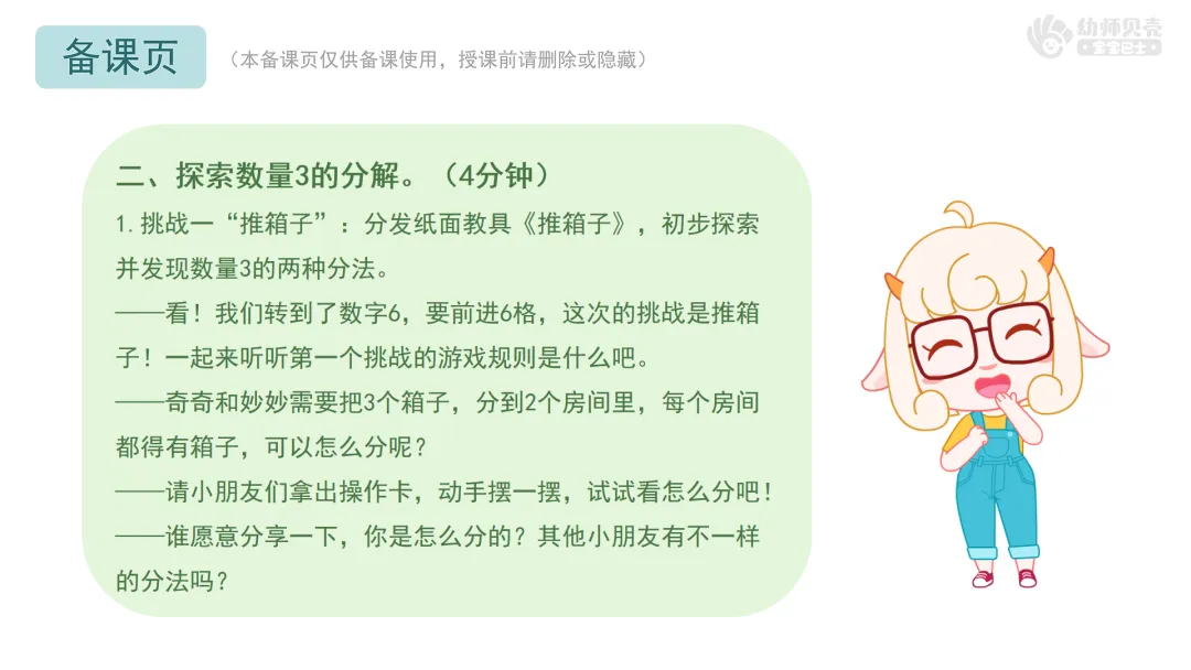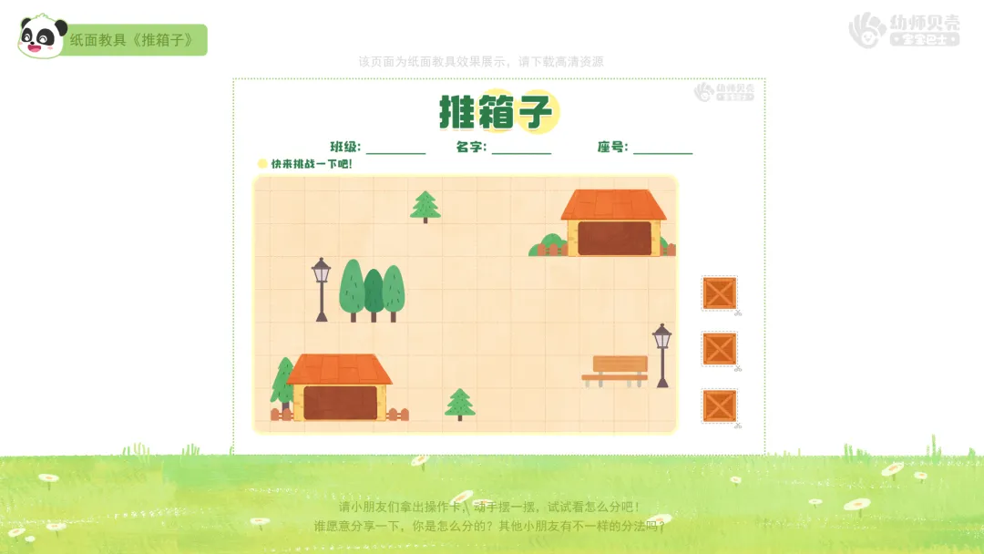 1.挑战一“推箱子”:分发纸面教具《推箱子》,初步探索并发现数量3的两种分法。