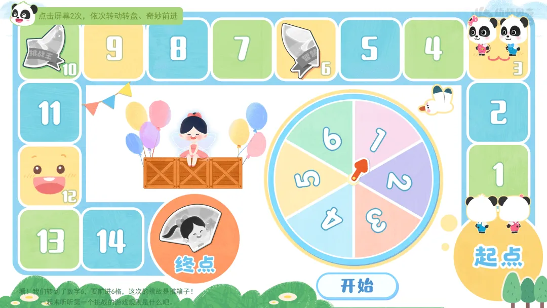 ——看!我们转到了数字6,要前进6格,这次的挑战是推箱子!一起来听听第一个挑战的游戏规则是什么吧。