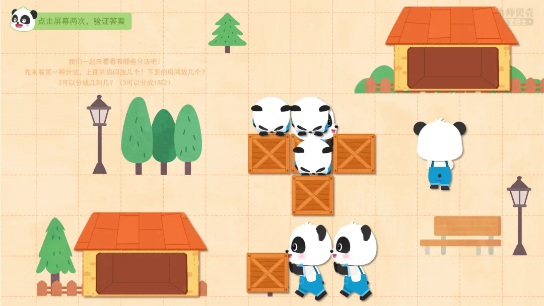 ——先来看第一种分法,上面的房间放几个?下面的房间放几个?3可以分成几和几?(3可以分成1和2)
