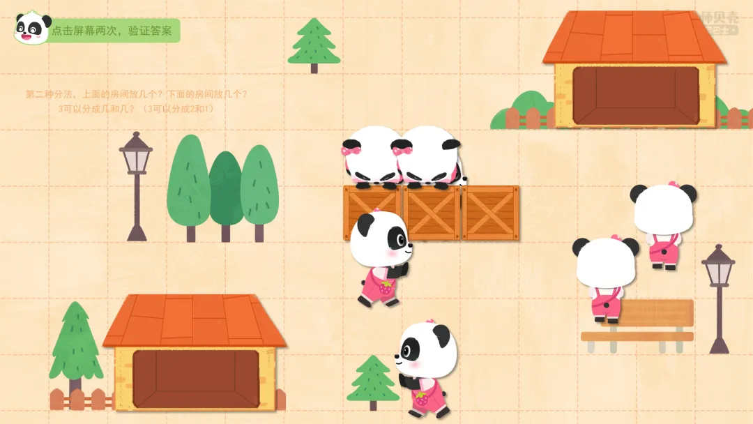 ——第二种分法,上面的房间放几个?下面的房间放几个?3可以分成几和几?(3可以分成2和1)
