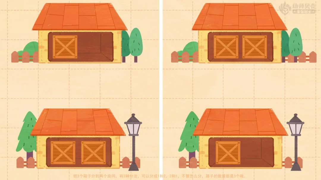 ——奇奇和妙妙需要把3个箱子,分到2个房间里,每个房间都得有箱子,可以怎么分呢?