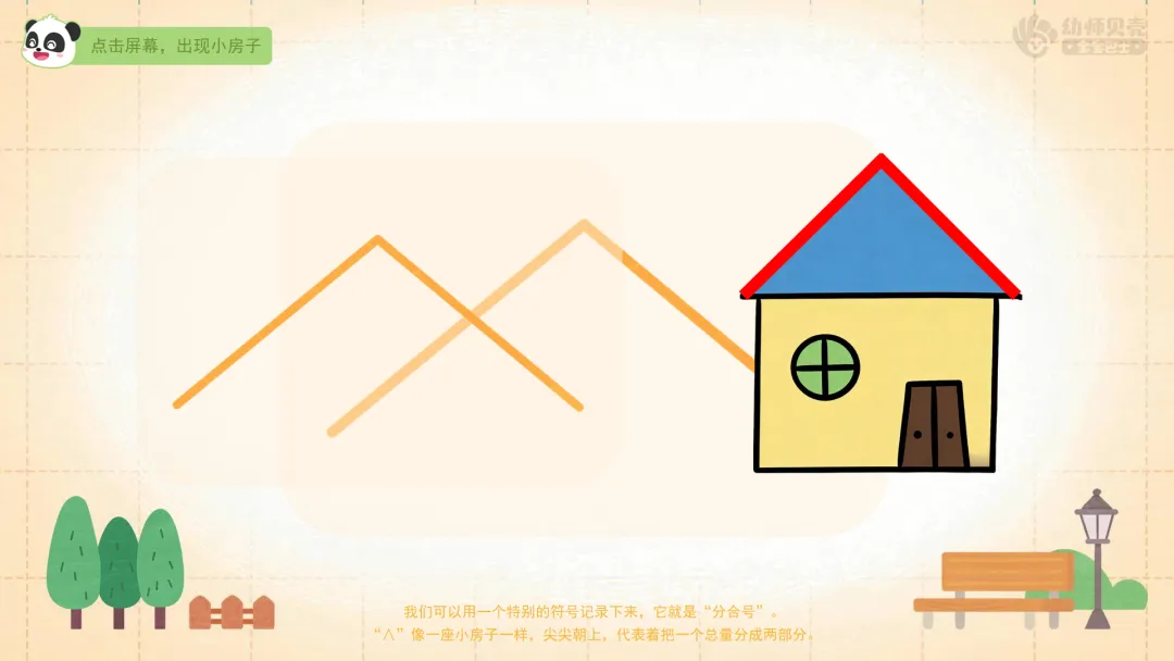 ——“∧”像一座小房子一样,尖尖朝上,代表着把一个总量分成两部分。一起用“∧”来记录一下奇奇妙妙分箱子的结果吧。