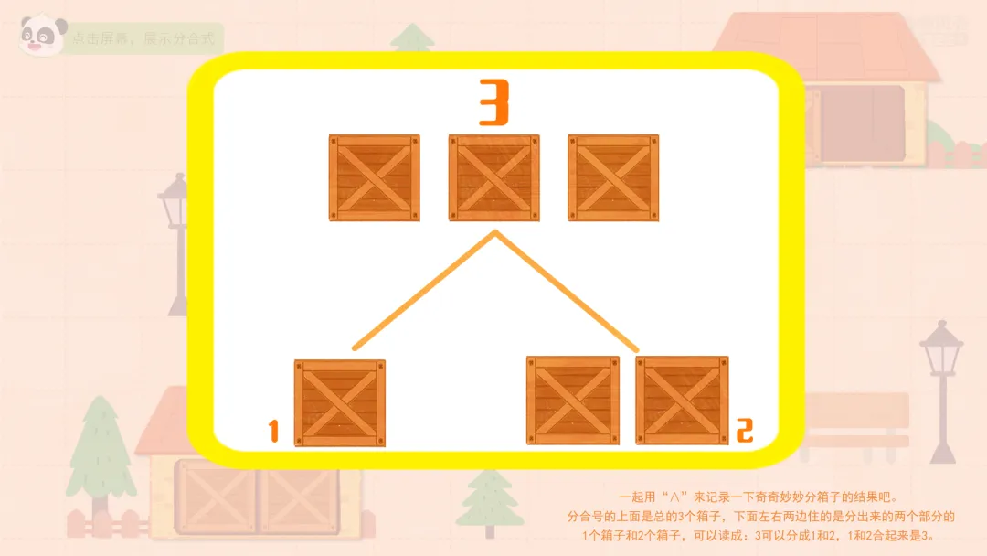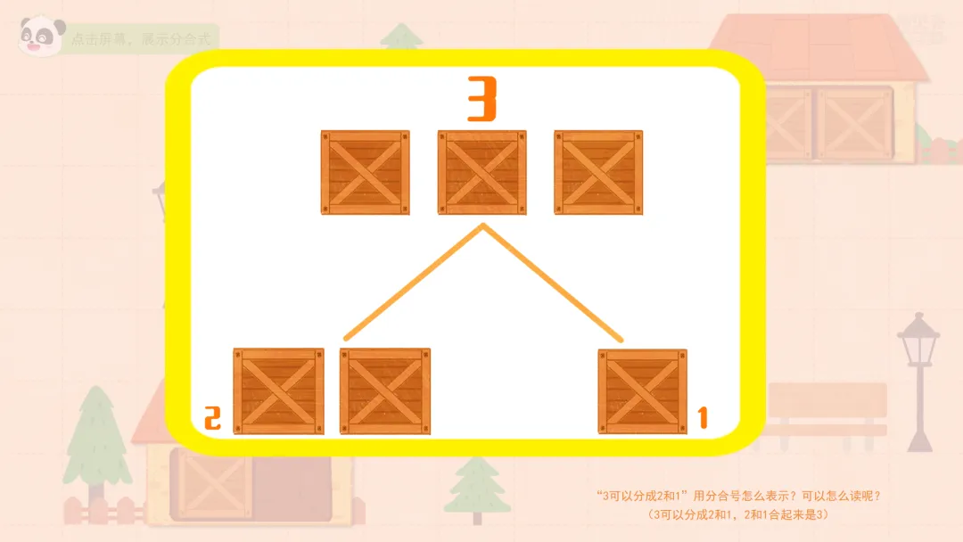 ——分合号的上面是总的3个箱子,下面左右两边住的是分出来的两个部分的1个箱子和2个箱子,可以读成:3可以分成1和2,1和2合起来是3。