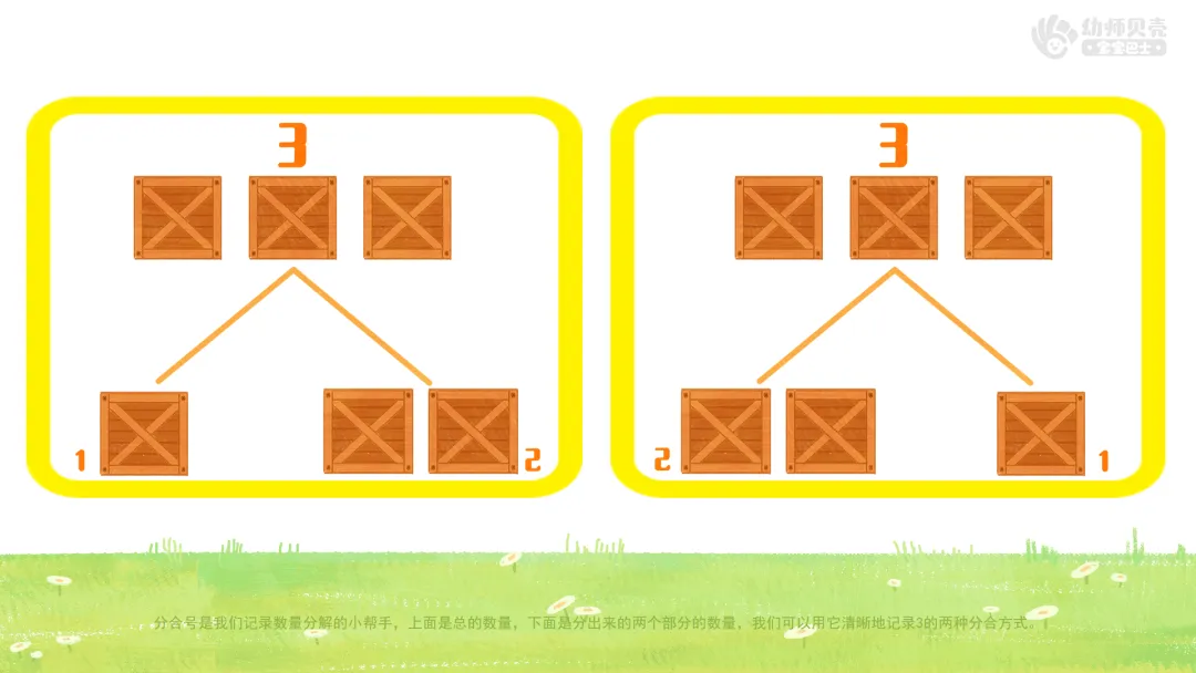 小结:分合号是我们记录数量分解的小帮手,上面是总的数量,下面是分出来的两个部分的数量,我们可以用它清晰地记录3的两种分合方式。