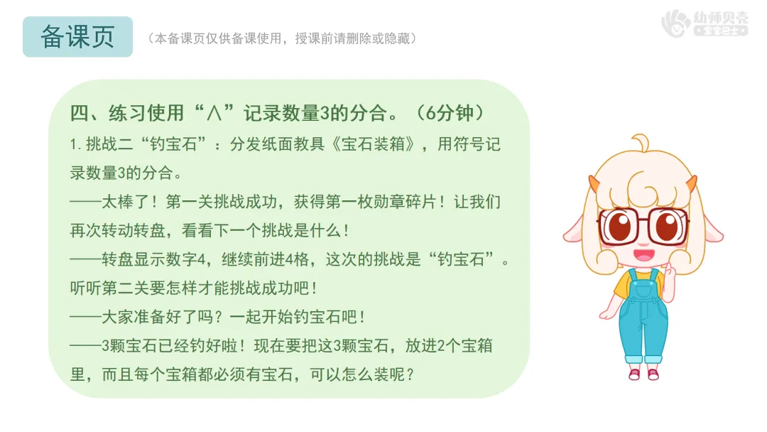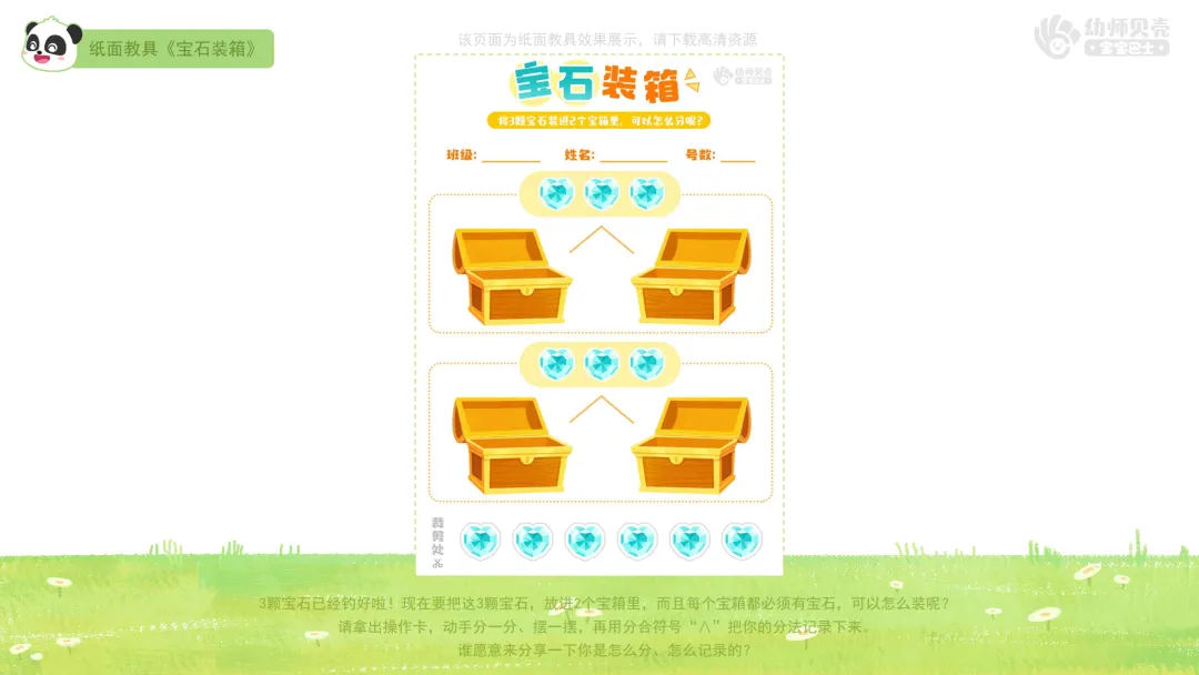 1.挑战二“钓宝石”:分发纸面教具《宝石装箱》,用符号记录数量3的分合。
