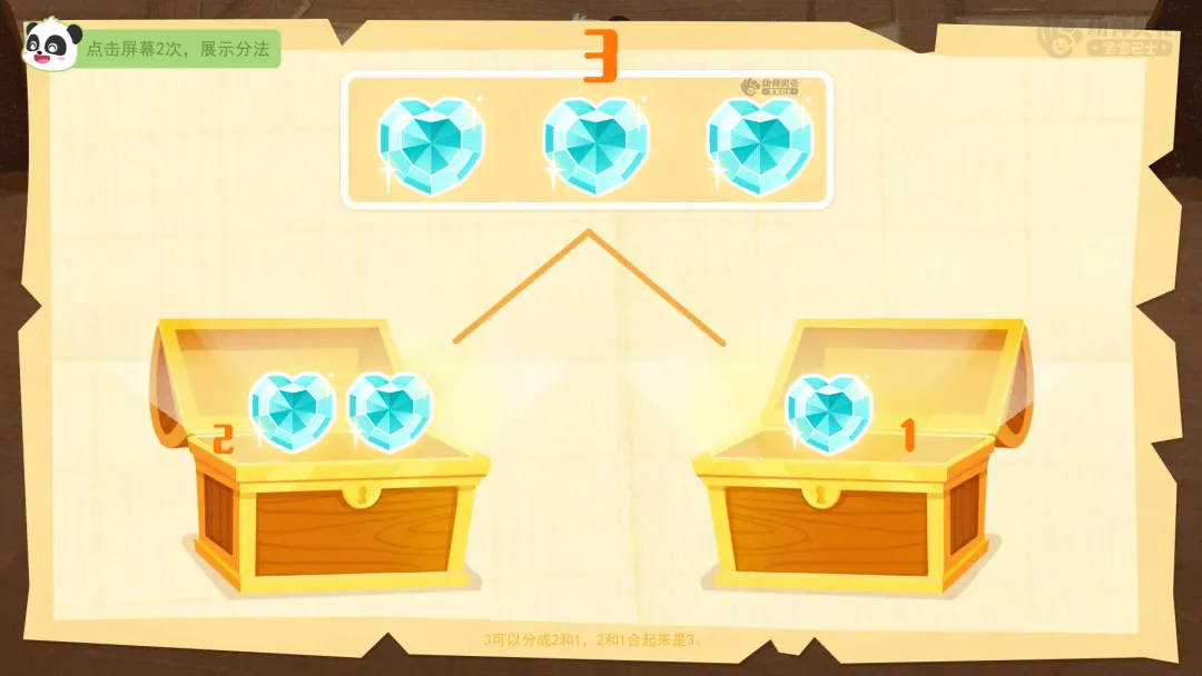 ——3颗宝石已经钓好啦!现在要把这3颗宝石,放进2个宝箱里,而且每个宝箱都必须有宝石,可以怎么装呢?