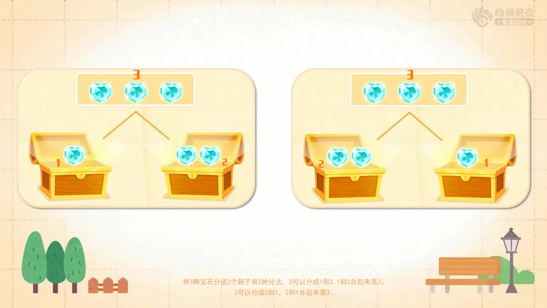 小结:将3颗宝石分进2个箱子有2种分法,3可以分成1和2,1和2合起来是3;3可以分成2和1,2和1合起来是3。