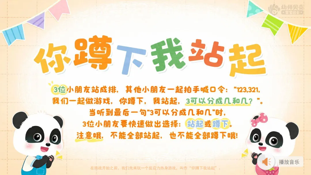——在挑战开始之前,我们先来玩一个游戏,叫作“你蹲下我站起”,大家准备好了吗?