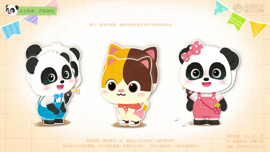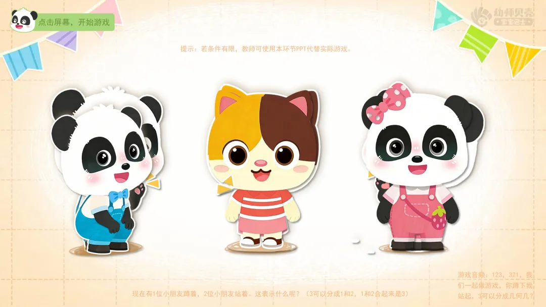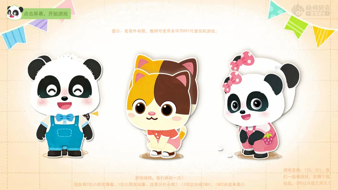 1.趣味游戏“你蹲下我站起”:巩固数量3的分合。