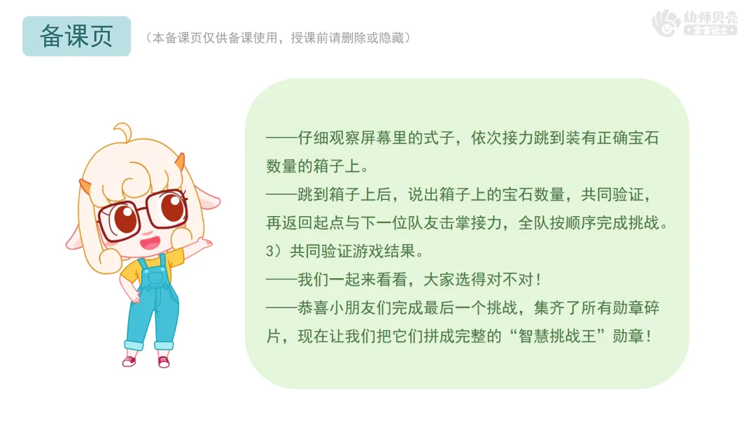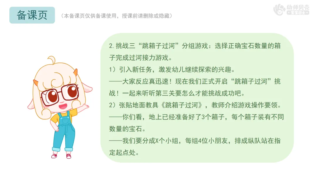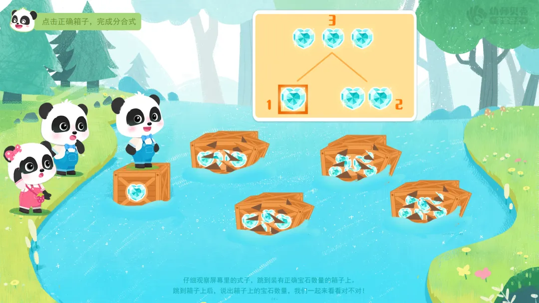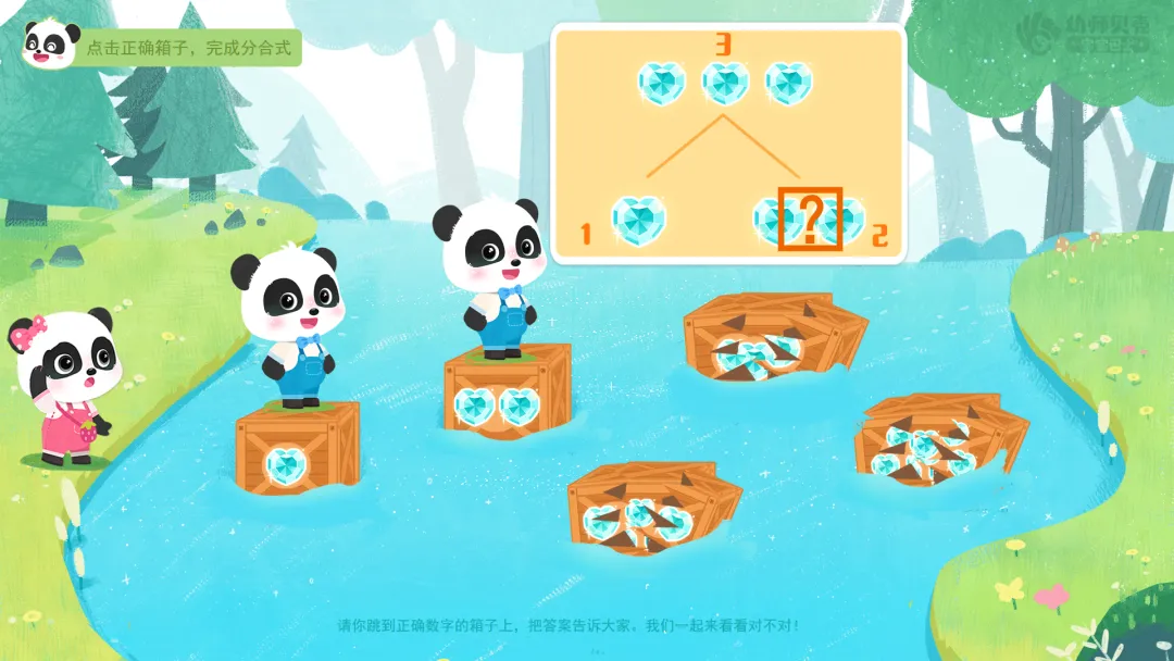 2.挑战三“跳箱子过河”分组游戏:选择正确宝石数量的箱子完成过河接力游戏。
