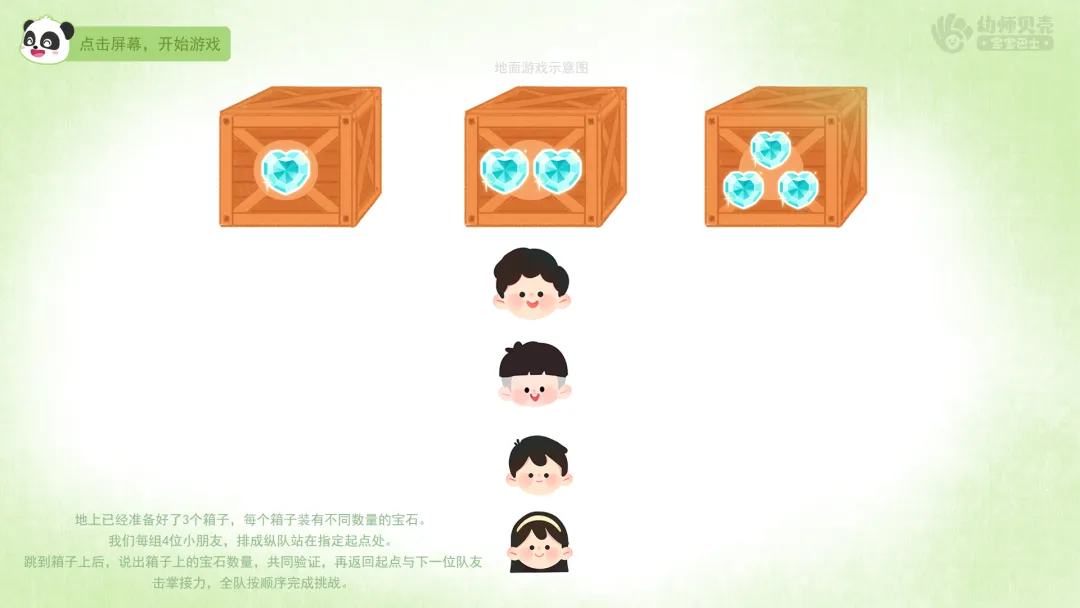 ——跳到箱子上后,说出箱子上的宝石数量,共同验证,再返回起点与下一位队友击掌接力,全队按顺序完成挑战。