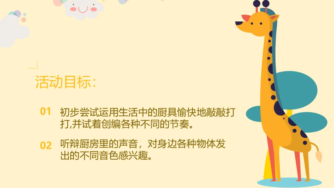 1.初步尝试运用生活中的厨具愉快地敲敲打打,并试着创编各种不同的节奏。