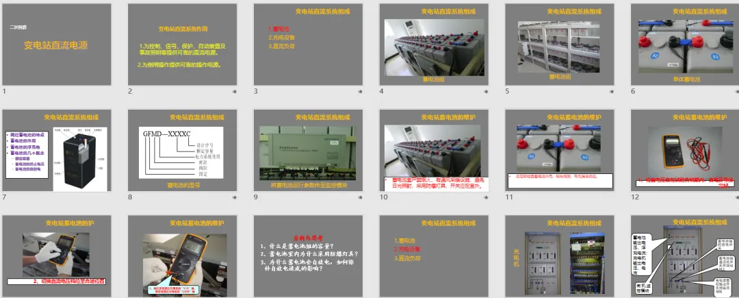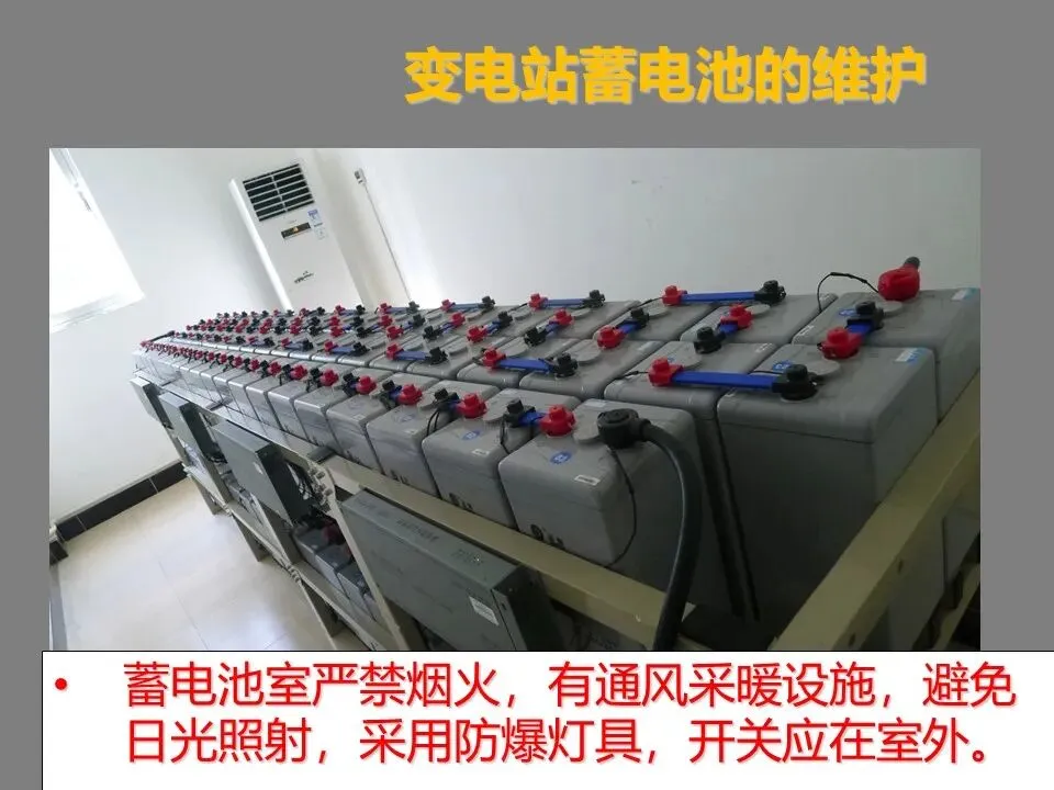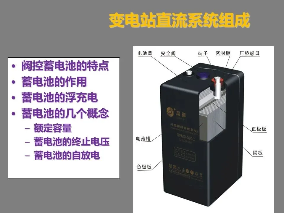 蓄电池是直流系统的核心。变电站直流系统的工作电压通常为220V或110V,弱电直流电压为48V。单体电压有2V的,也有12V的。早期有铅酸蓄电池,后来出现防爆铅酸蓄电池,现在普遍用的是阀控铅酸蓄电池,锂电池最好,无记忆性,但价格也高。