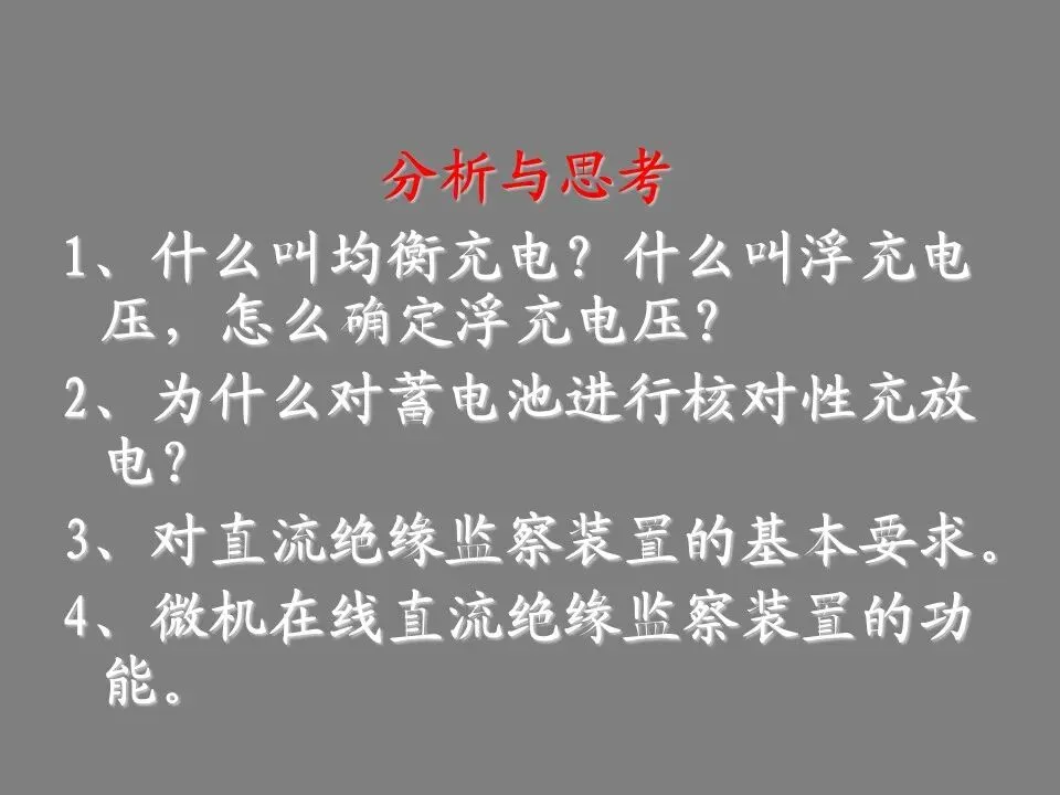 浮充电:充电装置并接蓄电池带直流负载。正常运行时充电装置在承担经常性负荷的同时向蓄电池补充充电,以补充蓄电池的自放电,使蓄电池组以满容量的状态处于备用。