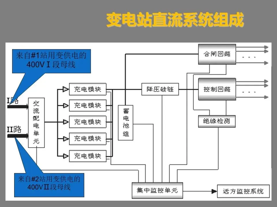 为什么不采用交流电源?交流电不能储存,而直流系统有蓄电池,在交流消失的情况下,直流系统可以通过蓄电池放电来供给直流负荷,甚至可以逆变成交流,供给后台机、五防机使用。变电站直流系统是为变电站的控制系统、继电保护、信号装置、自动装置提供电源;同时作为独立的电源在站用电失去后,直流电源还可作为应急的备用电源,即使在全站停电的情况下,仍应能保证重点保护装置、自动装置、控制及信号装置和断路器等的可靠工作,同时亦能供给事故照明用电。由于直流系统的负荷极为重要,所以直流电源应具有高度的可靠性和稳定性。因此确保直流系统的正常运行,是保证变电站安全运行的决定性条件之一。现在重要的变电站采用电源联络线线路侧接站用变的方式。