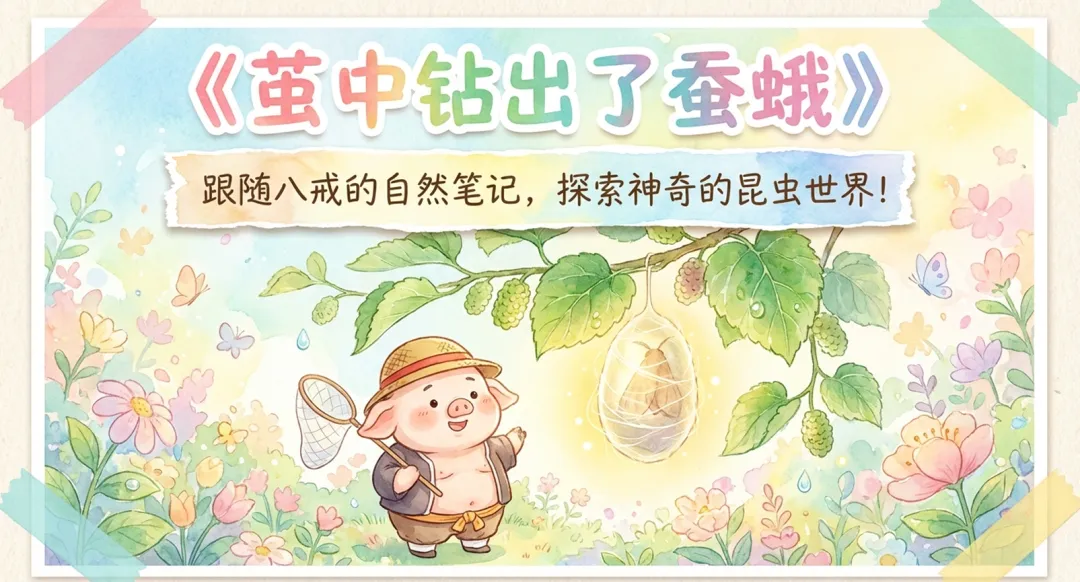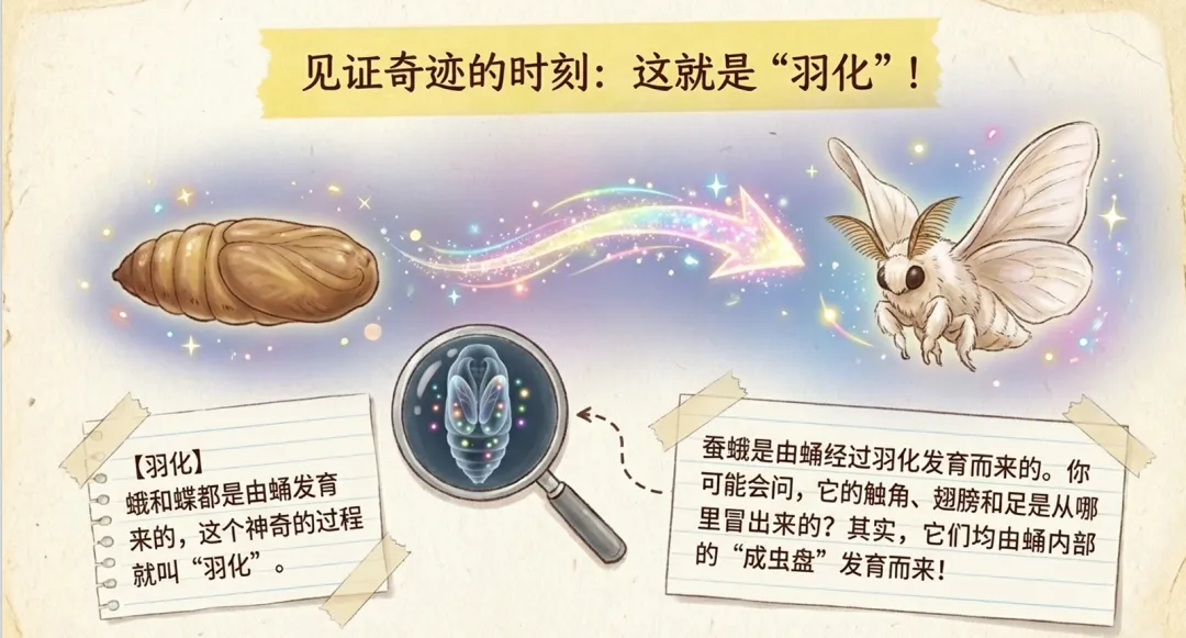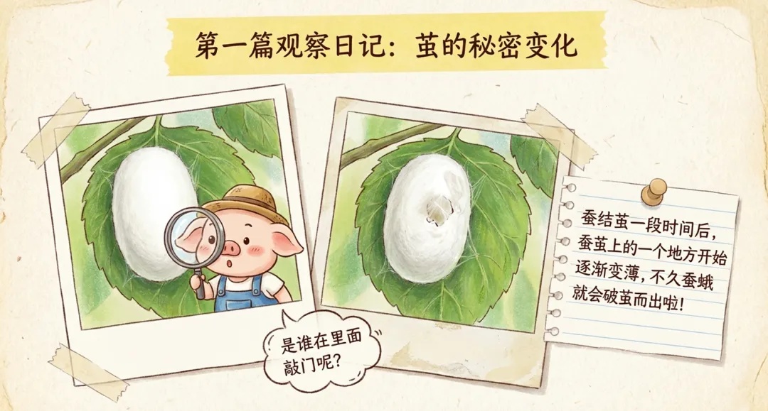 课件开篇以八戒的自然笔记为线索,引出第一篇观察日记,聚焦蚕茧内部的变化。随后呈现羽化过程,即蚕蛹蜕变为蚕蛾的关键阶段。这一过程被称为羽化,是昆虫发育中的重要生物学现象。