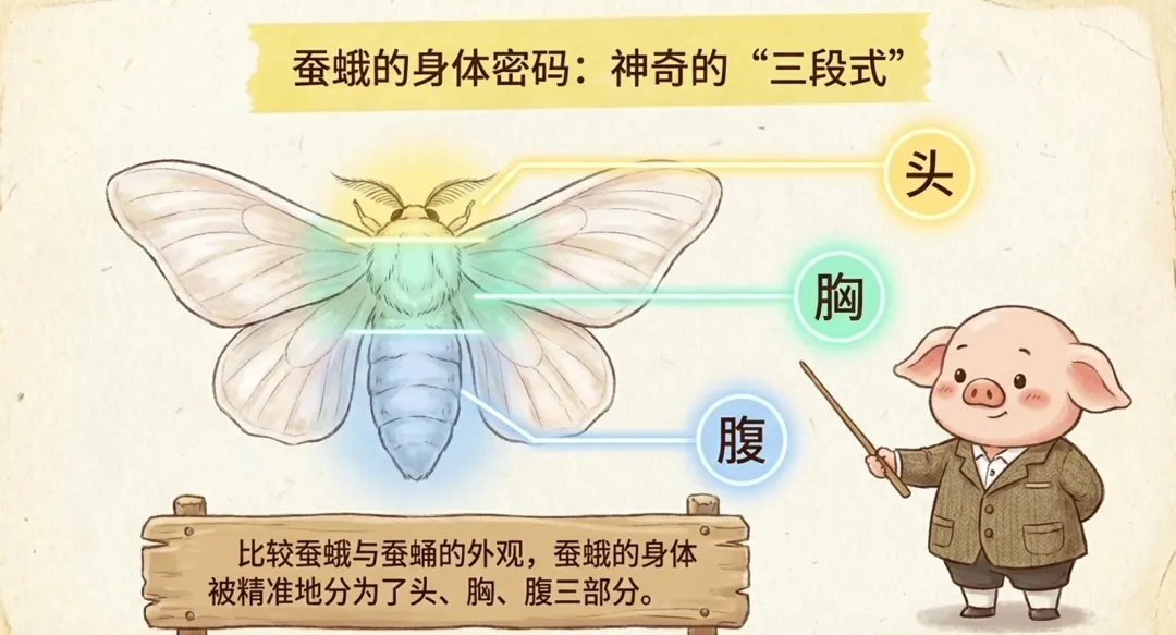 在蚕蛾身体结构的讲解中,课件明确指出蚕蛾的身体分为头、胸、腹三部分。这一结构与蚕蛹形成对比,帮助学生理解昆虫成虫的典型形态。头部配有一对羽状触角,胸部生有三对足和两对翅膀,但蚕蛾的翅膀较小,飞行能力较弱。腹部较为肥大,末端可见生殖器官。这些特征通过放大镜视角呈现,便于学生细致观察。