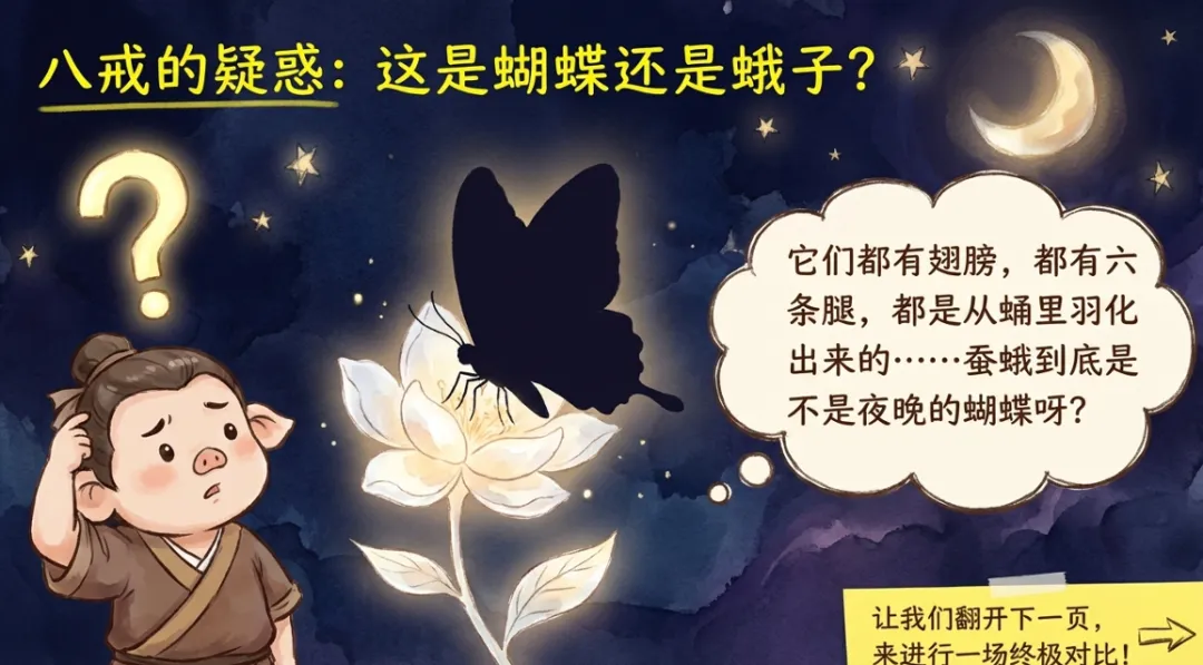 为帮助学生区分常见昆虫,课件设置蚕蛾与蝴蝶的对比。通过表格形式,比较两者在触角形态、翅膀大小与飞行能力、活动时间等方面的差异。