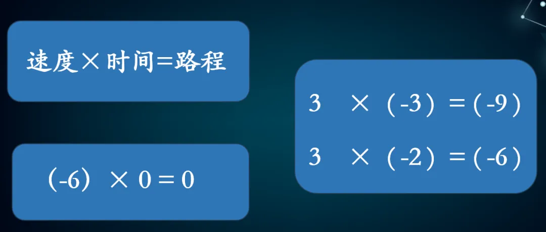 ①.两个负数相乘的秘密就在下面这个公式里:速度×时间=路程。