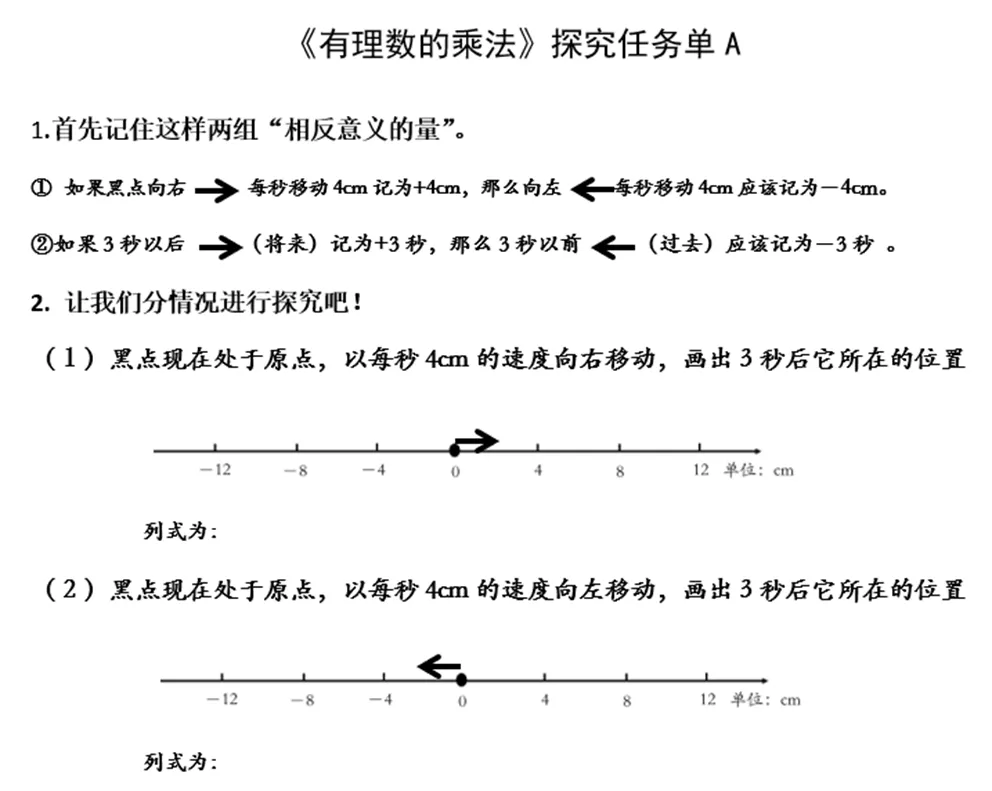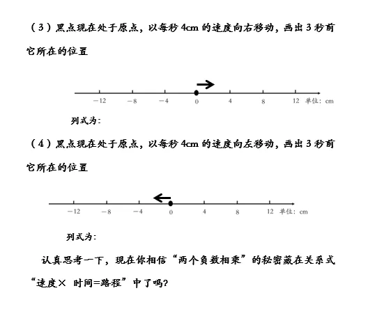 教师重点让学生说明4是指的什么?3是指的什么?多提问,引导学生汇报。最后让学生理解原来速度×时间的这个关系式中总结出两个负数相乘的运算方法。