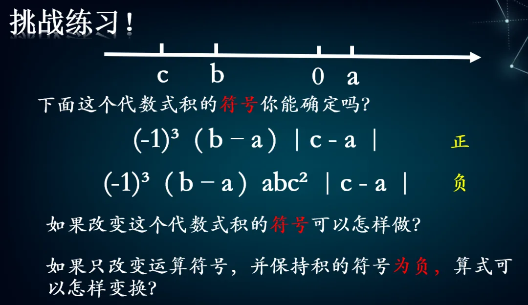 3.教师追问:如果我现在想改变代数式积的符号,那么咱们可以采取什么办法?