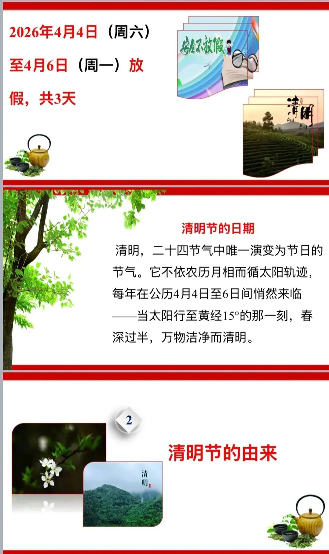 远处春的景色映入了我的眼帘,鸟儿唱着春天的奏鸣曲,漫山的桃红柳绿,遍地金黄的油菜花,“嫩芽吹叶落”,绿油油的嫩芽长了出来,到处是一片春意盎然、万物复苏的景象,这是一个充满期望和祝福的季节。清明时节,我们在这样一个特殊的日子里,我们在缅怀过去的同时,也要对未来充满希望,珍惜生命,让自己的生命更有意义,不要虚度了这样一个美好的人生。还要对生命有一个重新的认识,让自己的每一天都充充实实的,这样才会不让自己遗憾,并且对得起他人。