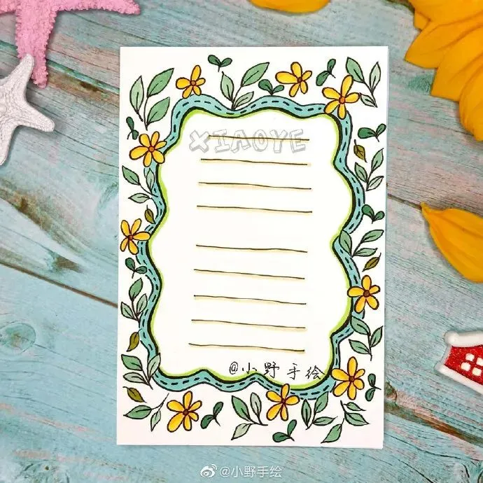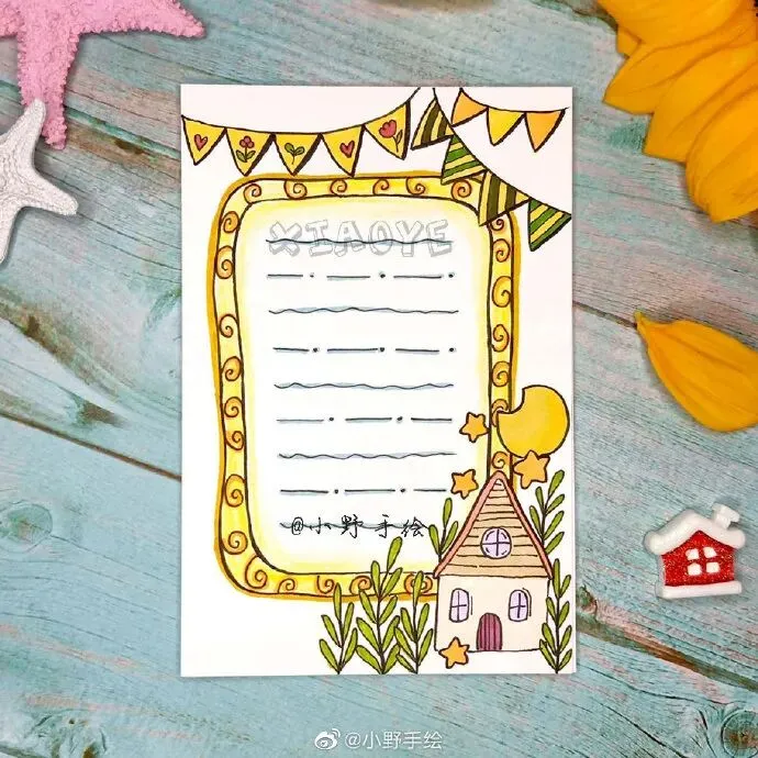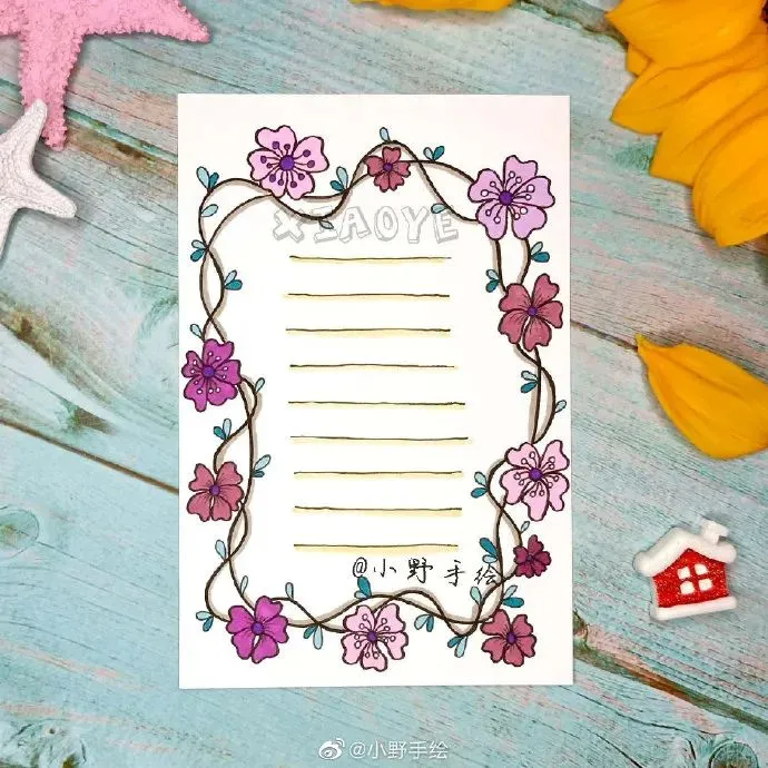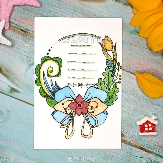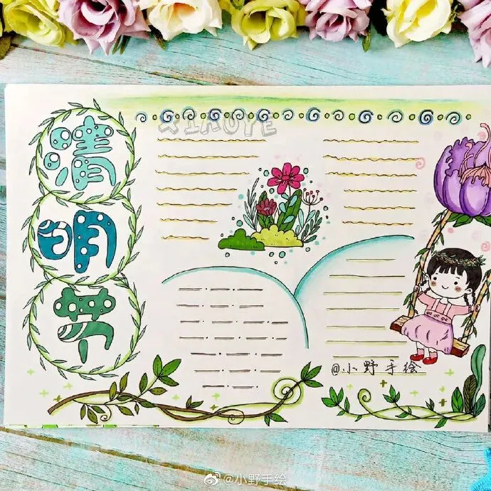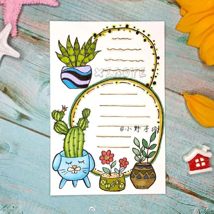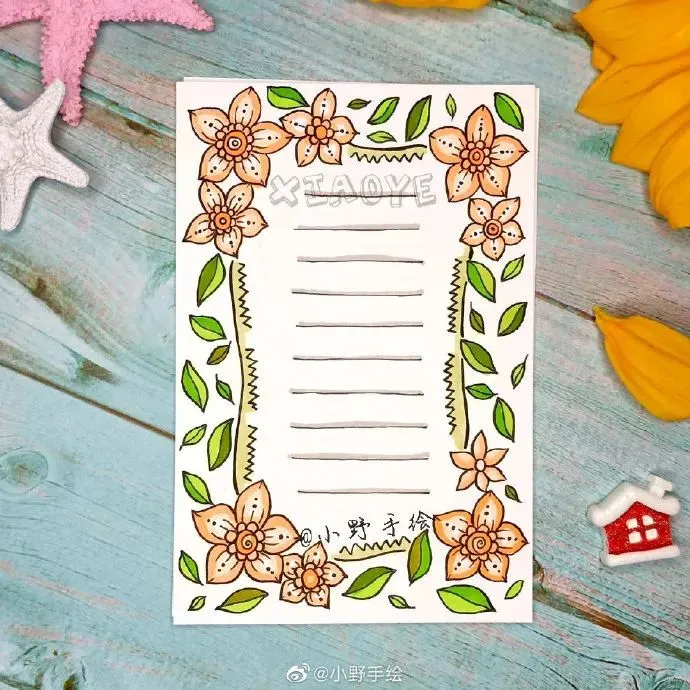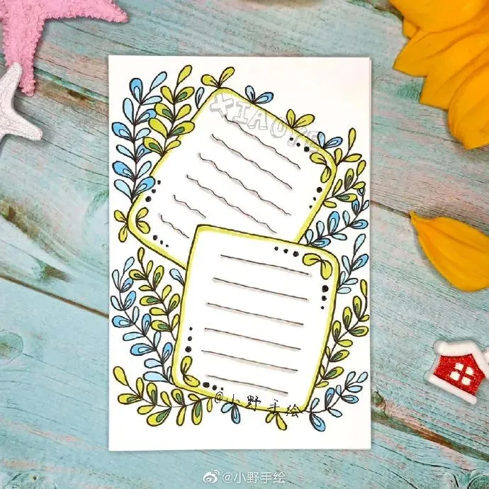 美化指的是文章抄写完毕后,对文章的周边或行距间进行尾花、花边的绘制。至于大的配图,应该先在预留位置,画出大体形状,剩余填色等完善工作则可后续完成。一边观察各种边框、花边及整体的搭配,对整个版面进行美化,这个过程是手抄报版面出效果的关键时刻。